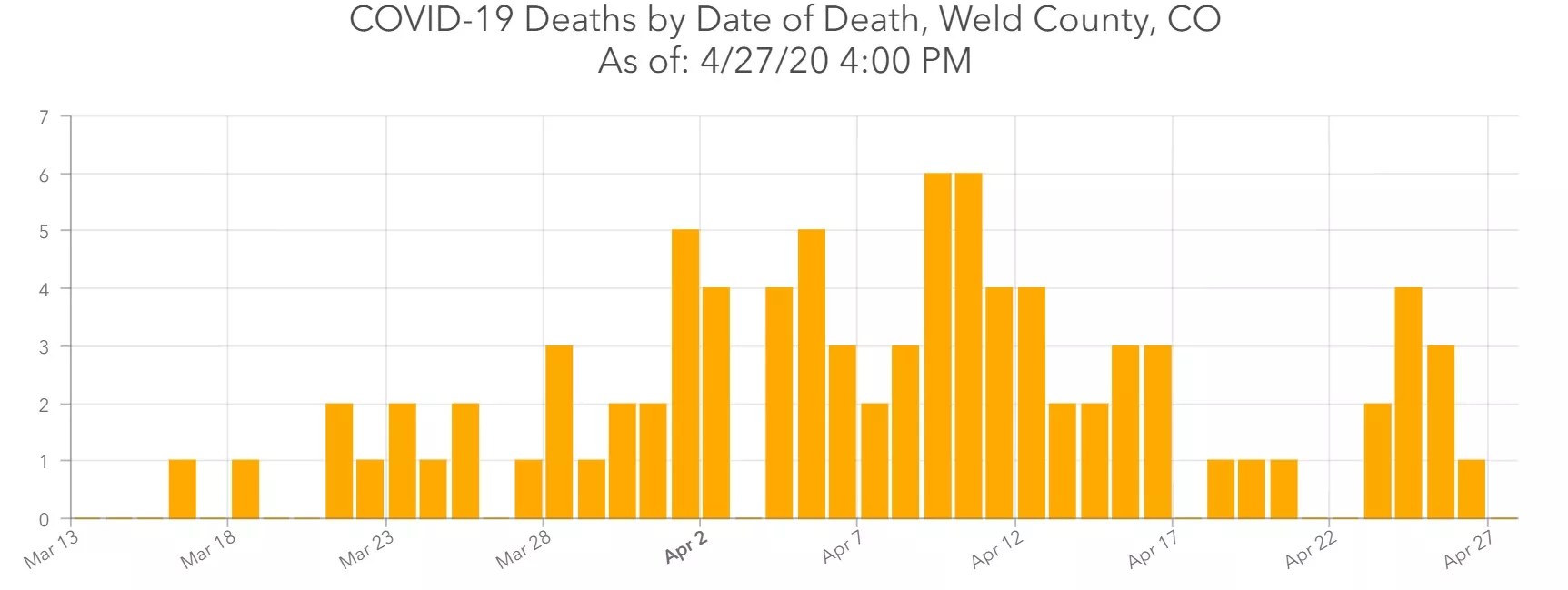 The latest figures from Weld County, updated at 4 p.m. on April 27, reveal 1,590 cases of the virus and 88 deaths, compared to 13,789 cases and 706 deaths for the state as a whole, according to the Colorado Department of Public Health update.