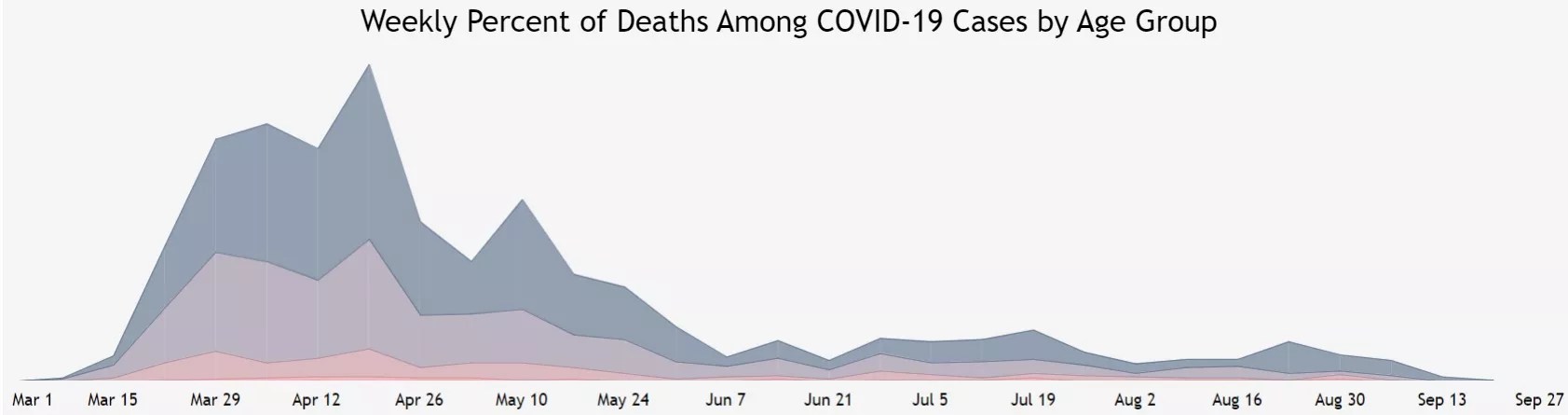 Now, however, the department offers only percentages, necessitating estimates based on the fatality total of 1,945. As of September 28, they translate to just over 32 deaths for those under 40, or 1.76 percent, approximately ninety deaths for those under 50, or 4.64 percent, around 221 deaths for those under 60, or 11.35 percent, and a tragic 1,721 deaths for those 60 and above, or 88.58 percent.