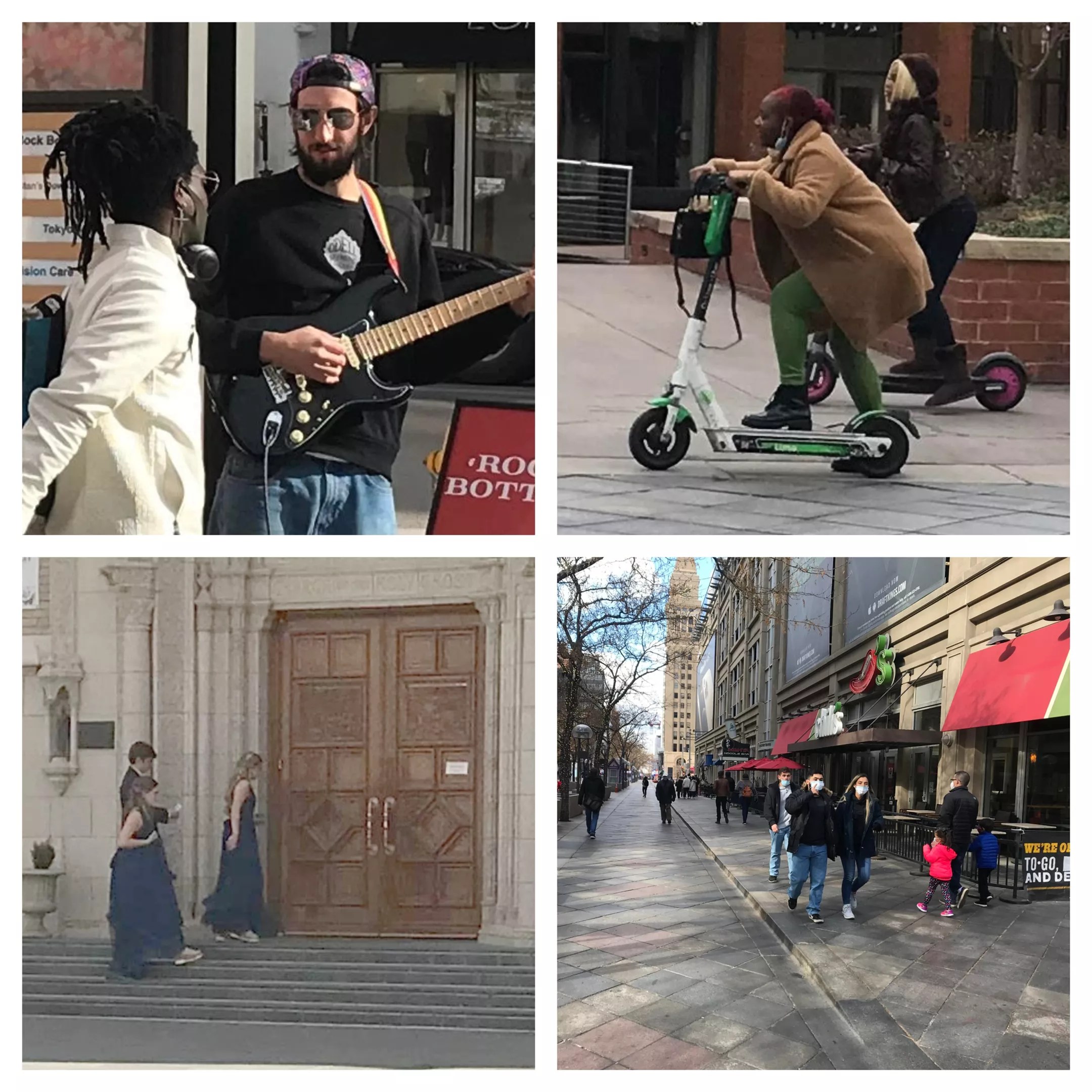 (Clockwise from upper left) A mask-free musician chats up a listener, also sans facial covering, on the 16th Street Mall on November 21; two unmasked scooter riders; pedestrians on the mall, where around 50 percent of the people wore masks; members of a wedding at nearby Holy Ghost Church.