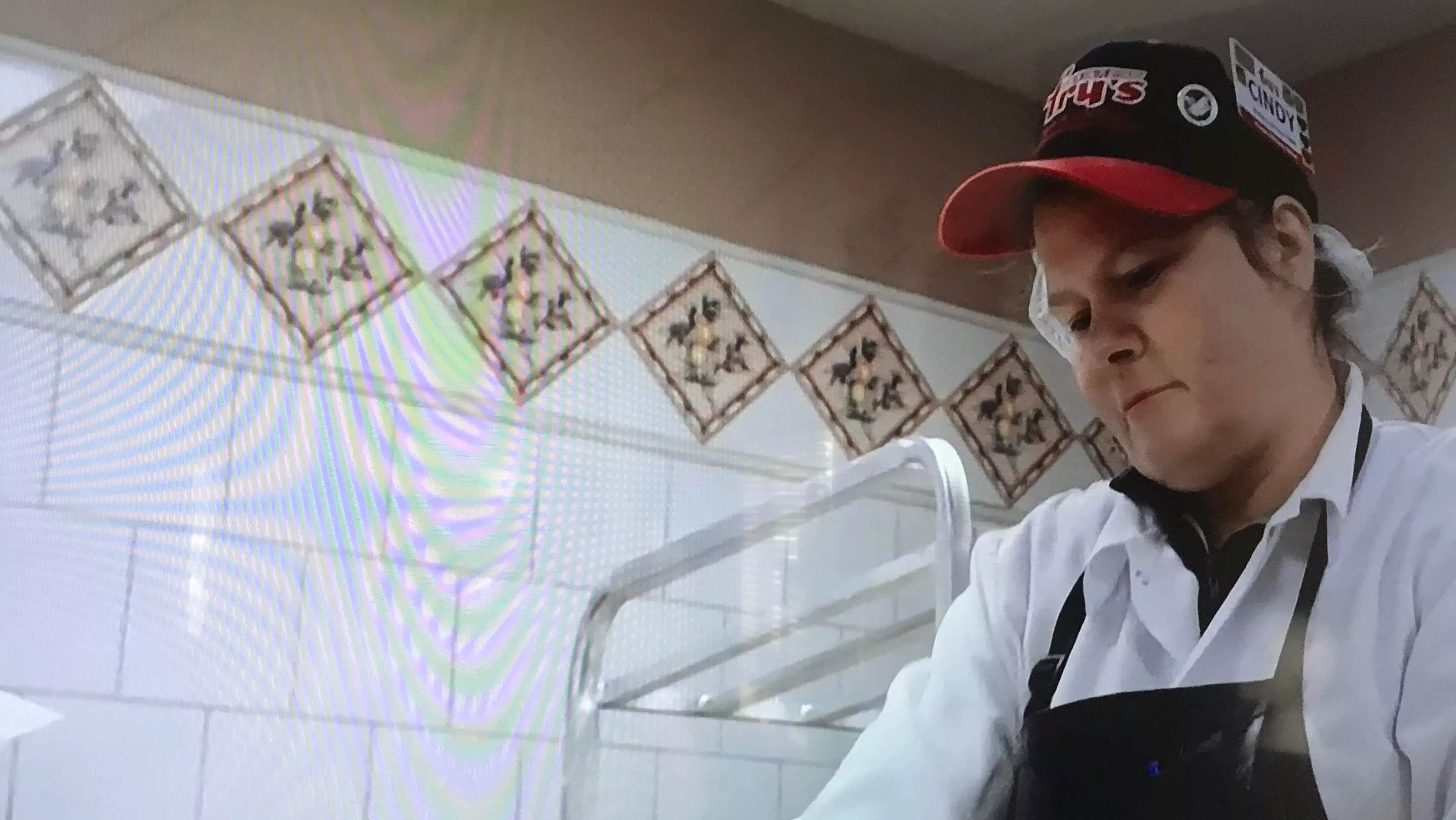 Another screen capture from the current Kroger commercial shows what appears to be an unmasked worker in the deli, where masks are frequently worn by men with beards.