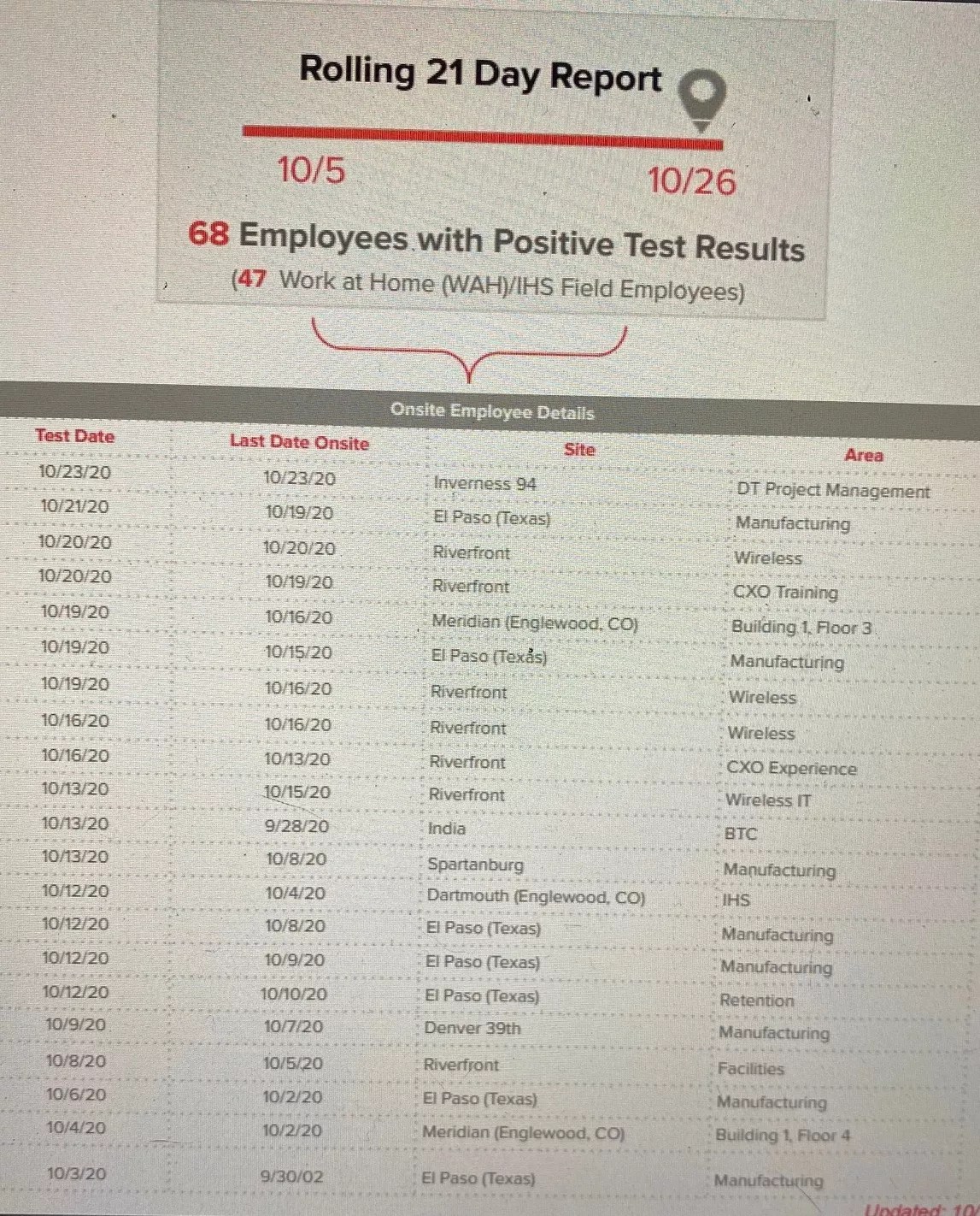 Here’s a look at a screen capture showing COVID-19 positives at DISH over that three-week period in October. Three cases were also registered at DISH’s Meridian office in Englewood, as well as one at a third site in Denver.