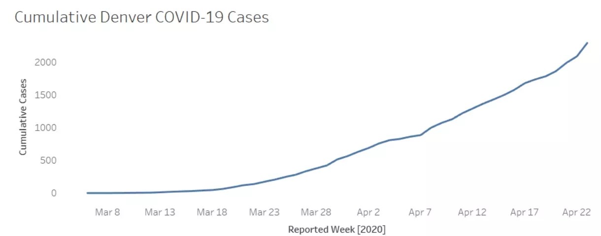 A similar trend line can be seen in other categories. Here are the cumulative Denver COVID-19 cases: