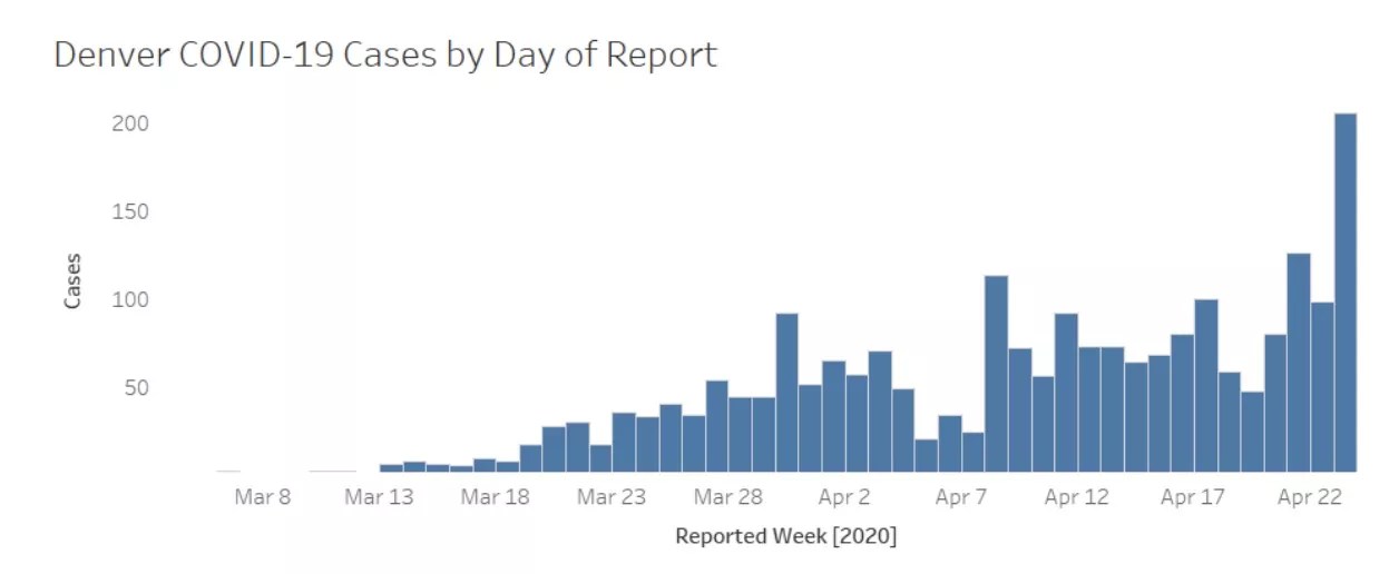 This trajectory is mirrored by a representation depicting Denver COVID-19 cases by day: