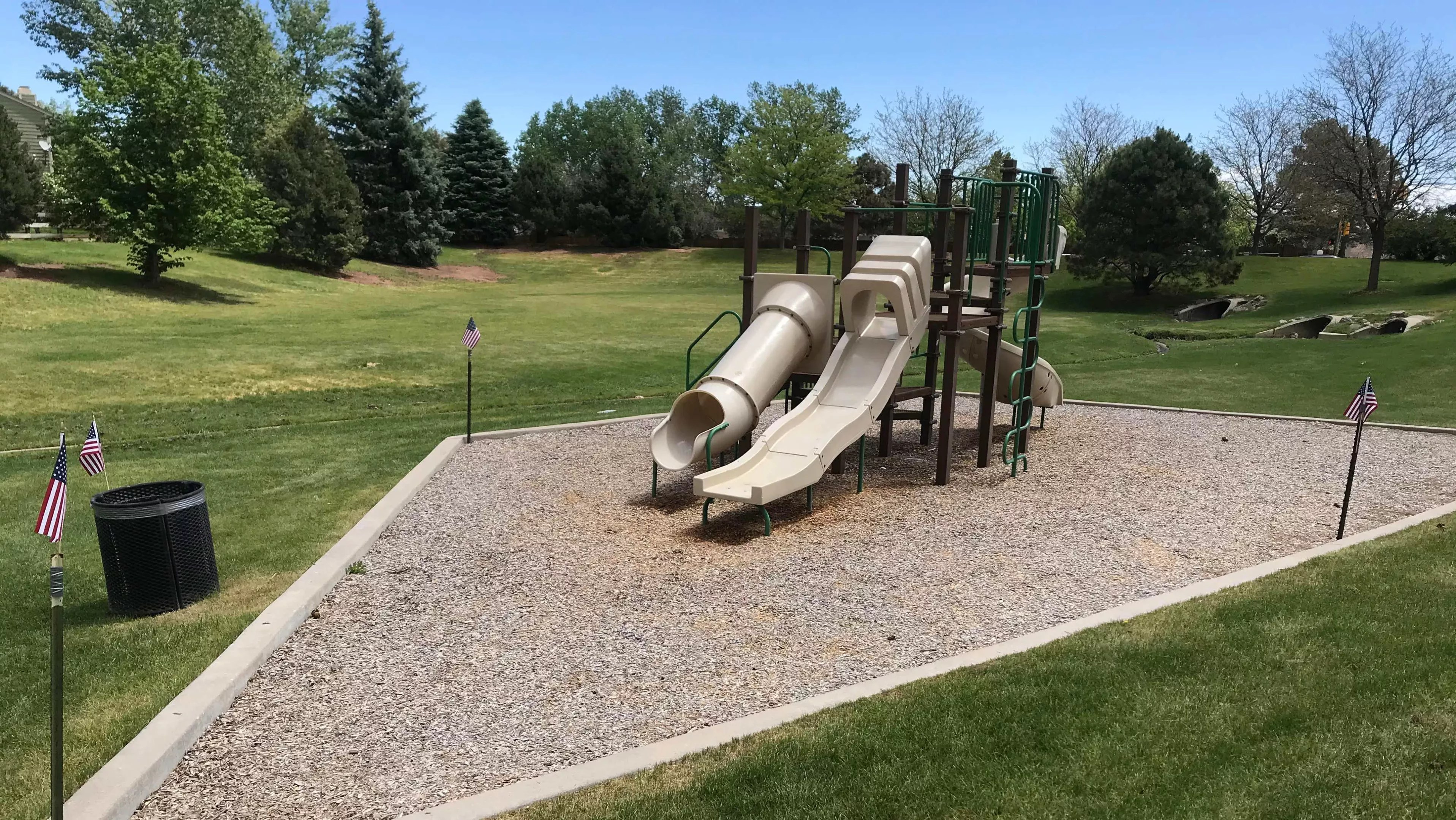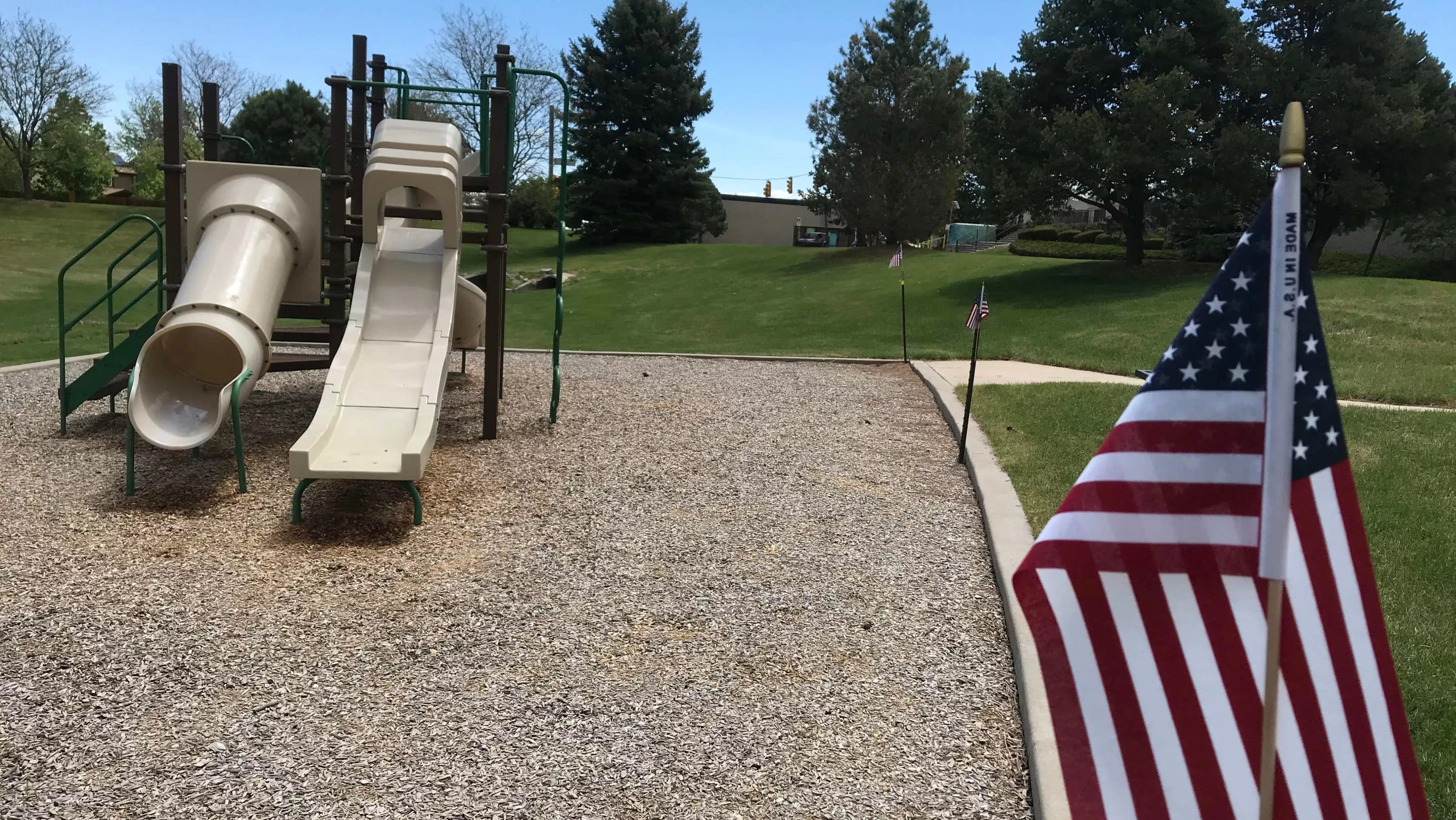Overnight, the yellow caution tape wrapped around playground gear in a park near West Ken Caryl Avenue and South Simms Street was removed, and poles planted around the slides and climbing apparatus to keep it in place were repurposed as holders for multiple American flags.