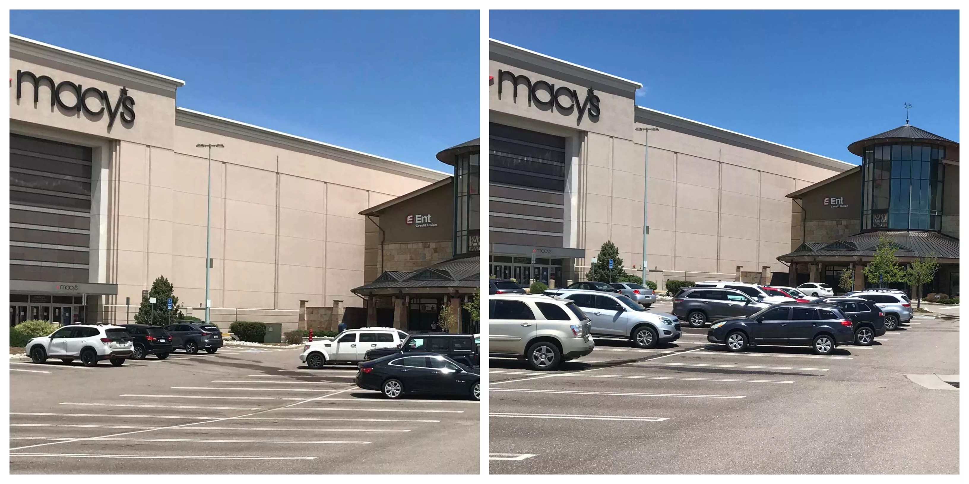 The Park Meadows parking lot outside Macy’s on Saturday, May 23, before the grand reopening, and on Monday, May 25.