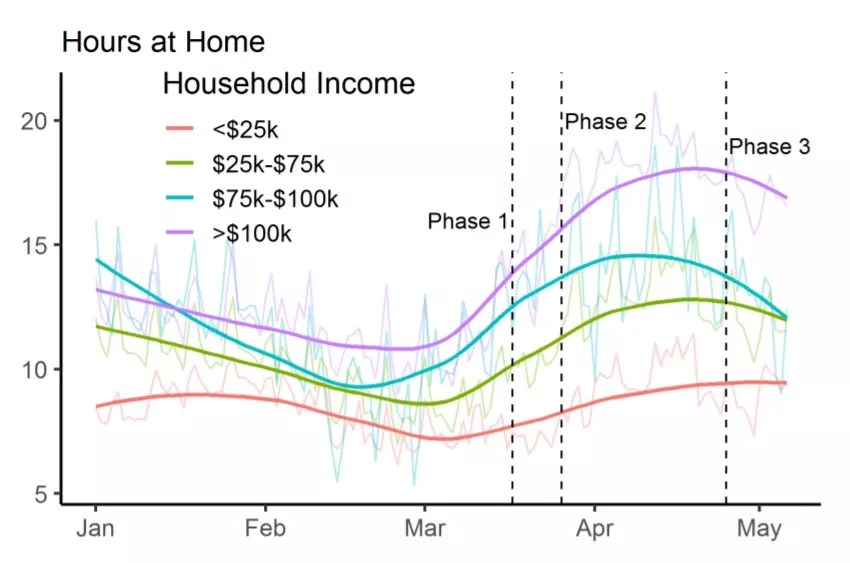 Among other things, the Colorado study looked at the hours that residents of this state spent at home by income level. The time was highest for those with the most resources, while those in lower brackets were able to stay at home less frequently. Those with household incomes of more than $100,000 topped the roster, followed by those bringing home $75,000 to $100,000; $25,000 to $75,000; and finally, below $25,000.