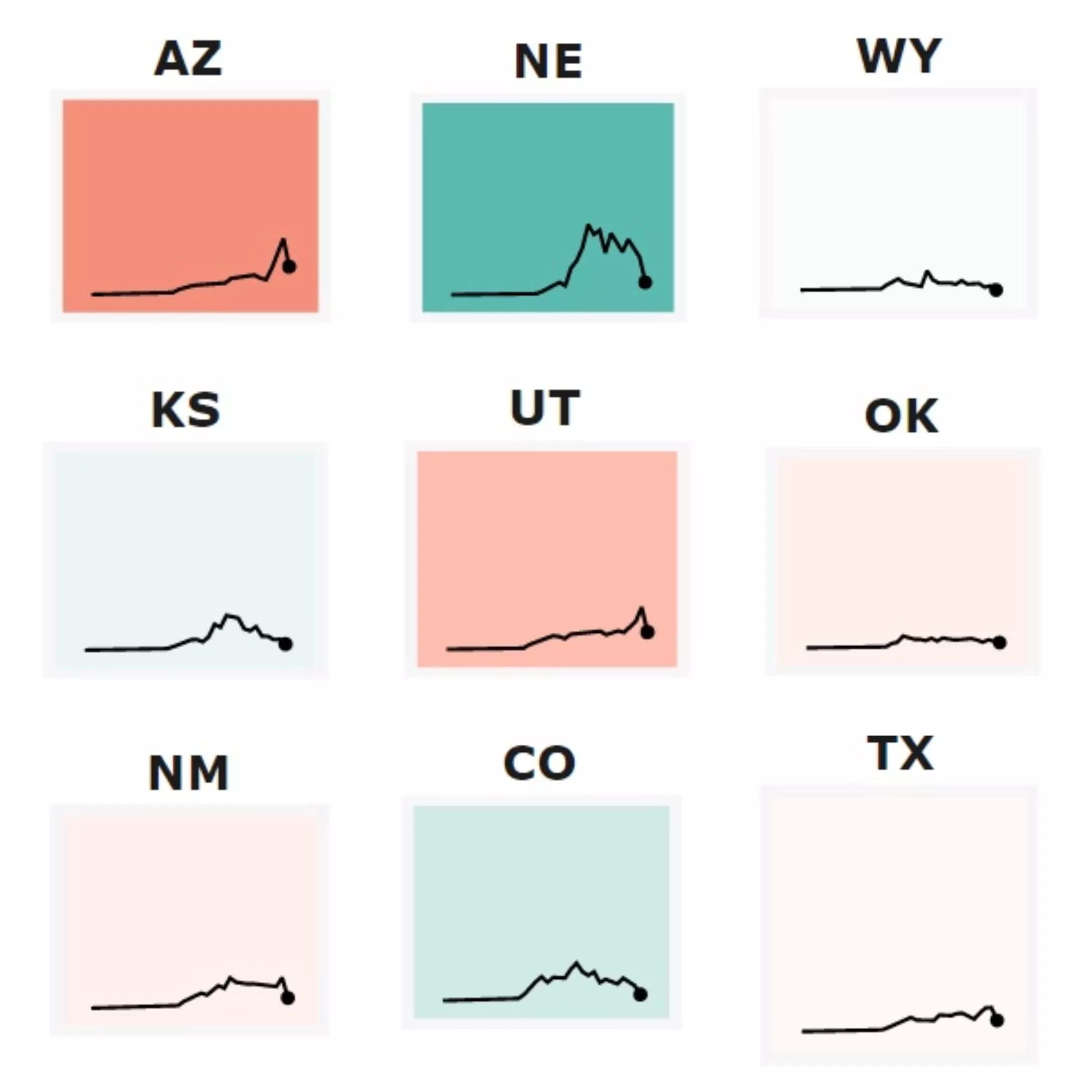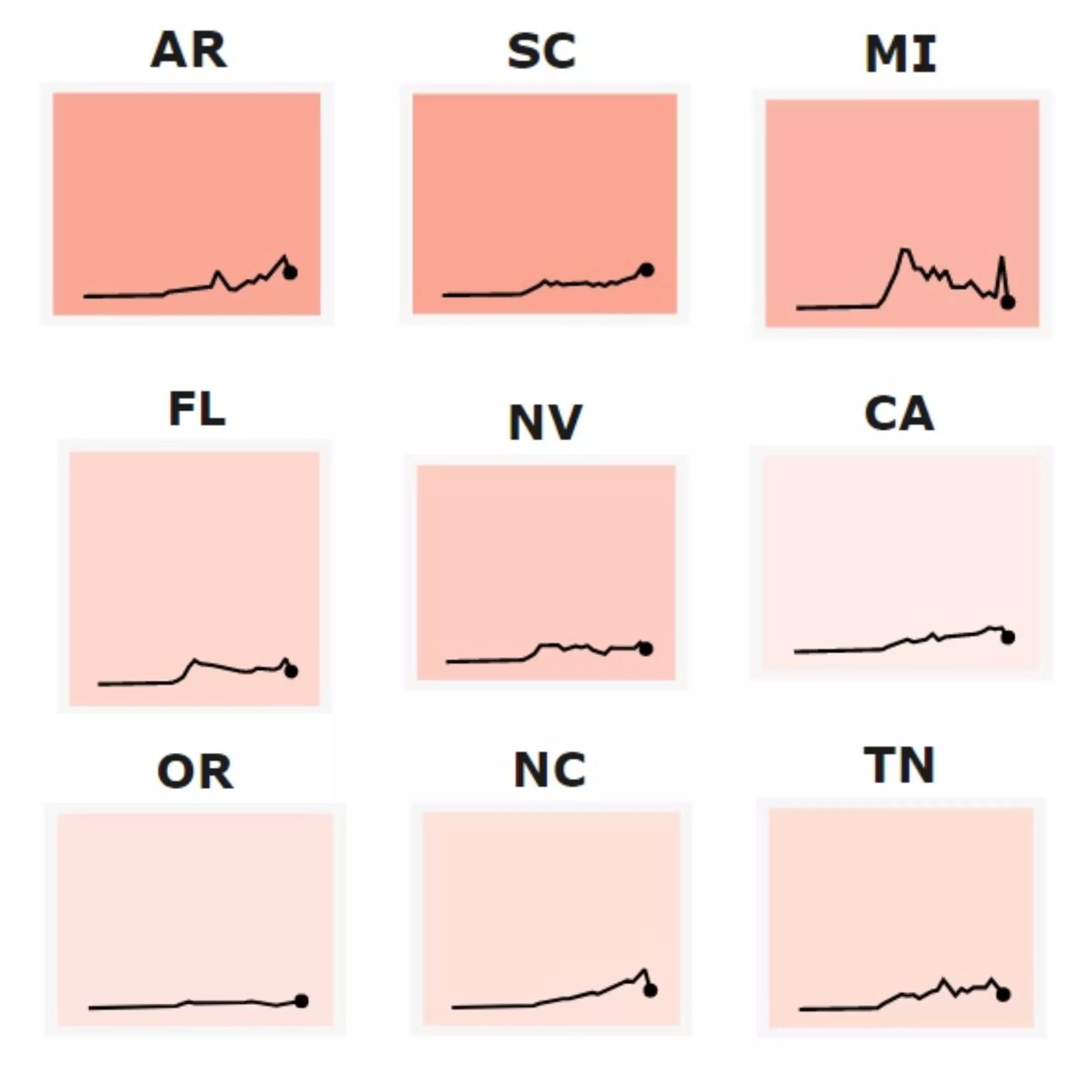 Thumbnails show a five-day moving average of new cases per day in each state; the graphics are color-coded in a way that makes interpretation a snap. “The greener the background, the bigger the downward trend of new cases in this state,” the key explains. “The redder the background, the bigger the upward trend of new cases in this state.”