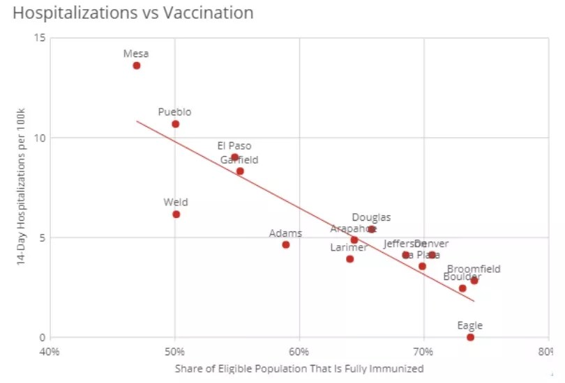 CDPHE-created graphics demonstrate that COVID-19 cases are much higher in counties with low vaccination rates, including Mesa, Garfield and El Paso. Here’s the breakdown: