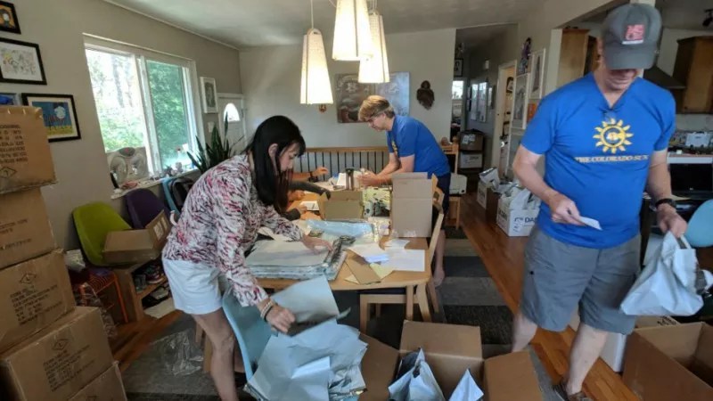 Colorado Sun staffers readying T-shirts for distribution to those who pledged on the publication’s Kickstarter page. At this writing, 2,622 backers have promised to pony up 1,493.
