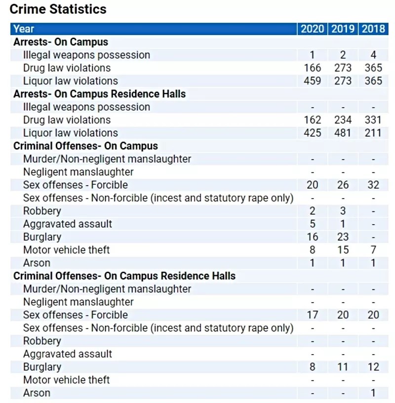 Such incidents aren’t commonplace at CU Boulder, but neither are they unknown, as demonstrated by 2018-2020 crime statistics for the campus shared on the Scholarships.com website. The site counts 32 on-campus forcible sex offenses in 2018, 26 in 2019 and twenty in 2020, and the majority of the crimes took place in residence halls: twenty in 2018 and again in 2019, and seventeen in 2020. However, the overwhelming majority of offenses involve violations of drug and liquor laws.