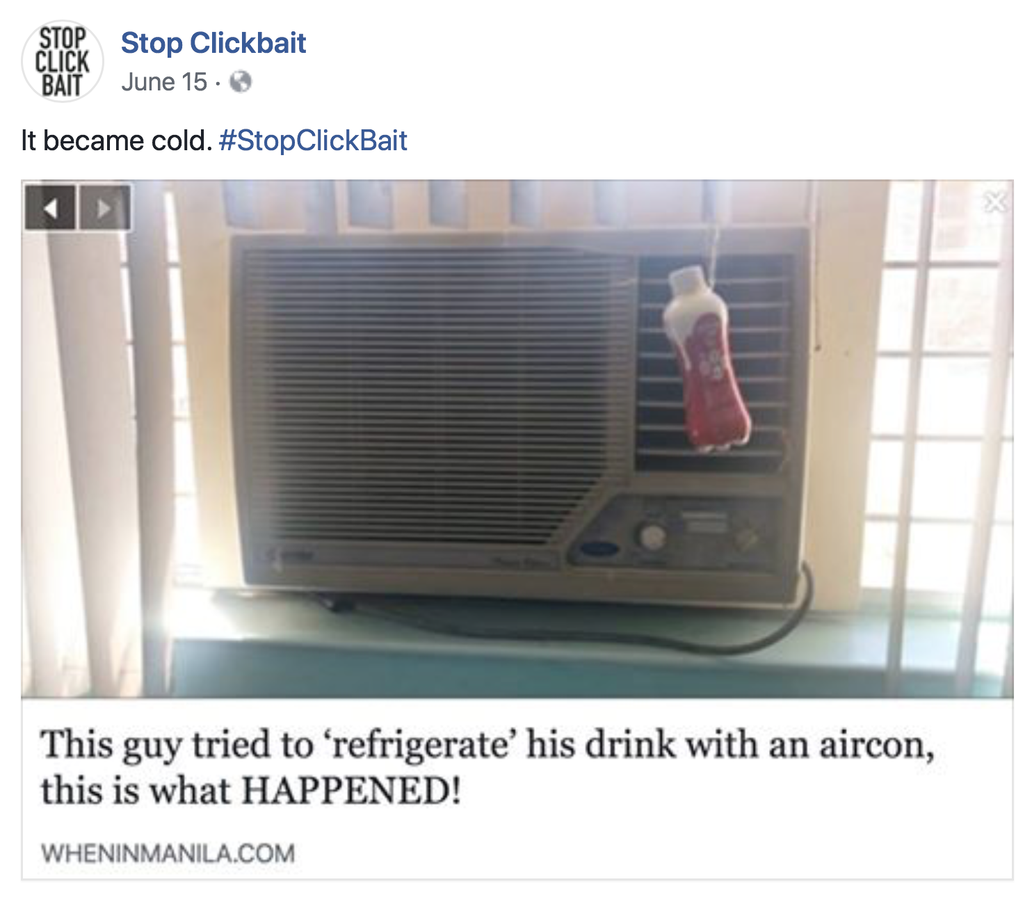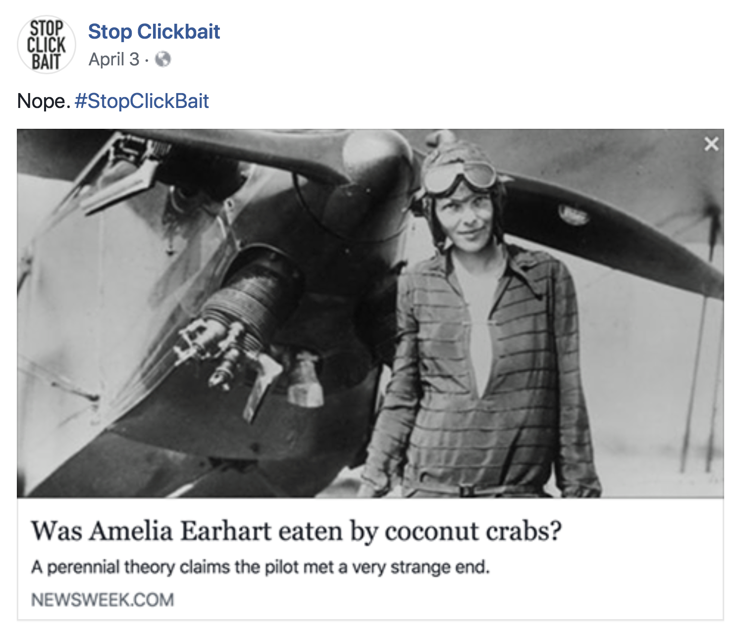 And, Tuttle explains, Stop Clickbait is also working on several measures that do stop individual clickbait from going viral. One is encouraging people to use the hashtag #StopClickbait on individual pages, to let anyone who sees it know its nefarious true purpose. Another is a browser extension that would allow clickbait-stoppers to post their own “reveal,” which would show up just below the post for any other users who have the app.