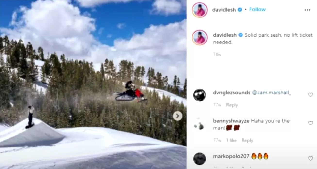 Lesh’s 2022 convictions stem from a snowmobiling stunt in April 2020, documented in a photo that Lesh posted on Instagram. He was convicted of trespassing in an area restricted during the COVID-19 closure, as well as unauthorized “work activity” on USFS property. For these offenses, he was sentenced to six months’ probation, 160 hours of community service and a $10,000 fine.