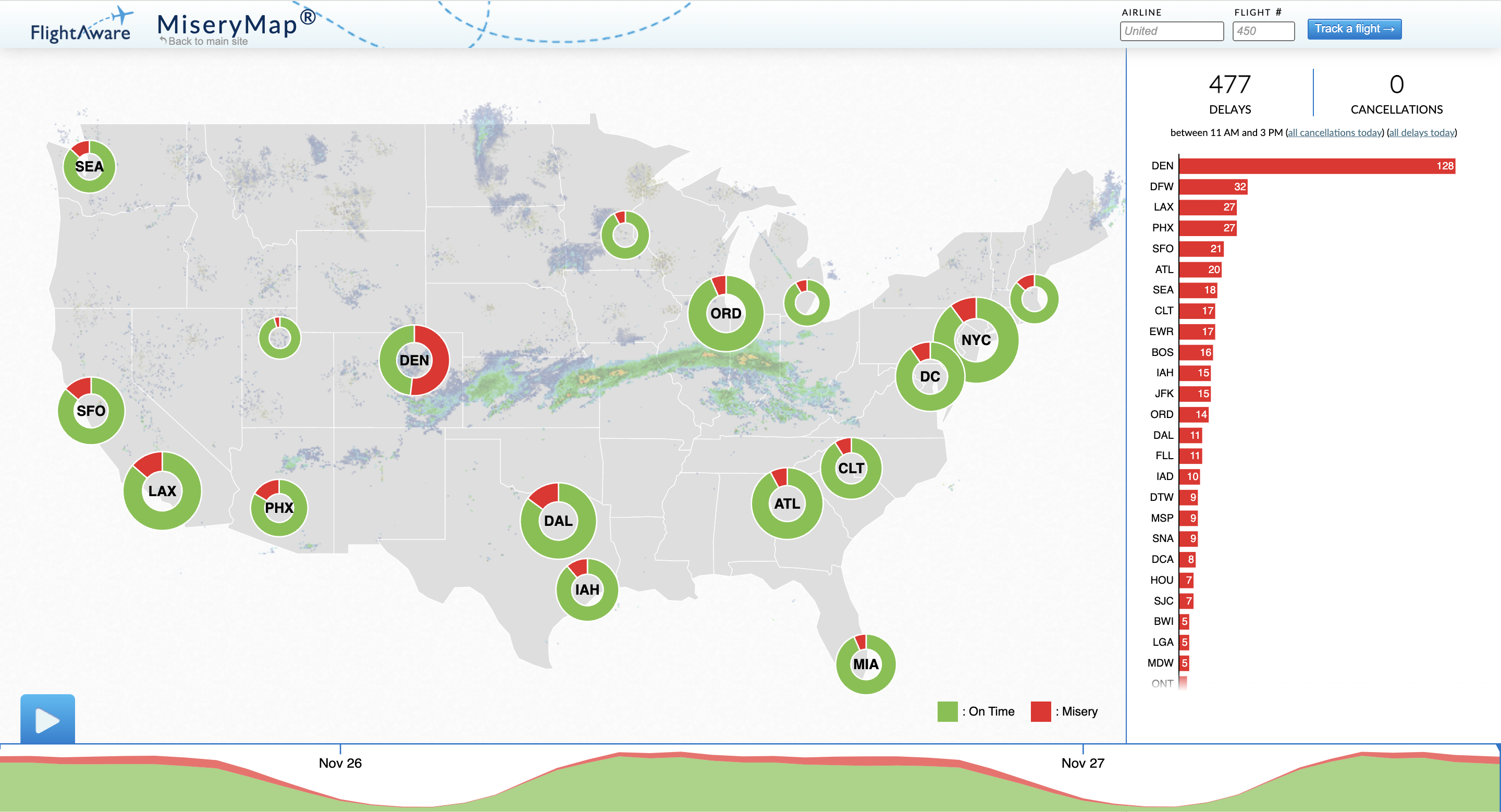 According to Flight Aware’s Misery Map, the Denver airport currently leads the country in delayed flights, at 128. Over 200 flights out of DIA were delayed earlier this morning. Flight Aware doesn’t report any upcoming cancellations at DIA at the moment, however, with just two flights canceled earlier than 1 p.m.