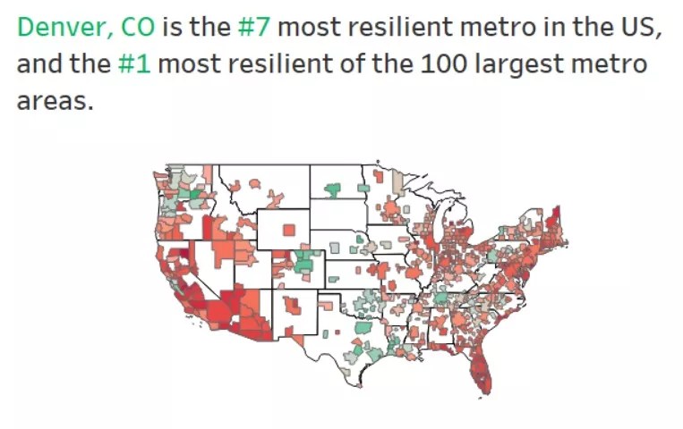 The Denver-Aurora-Lakewood metro area is doing much better than that, with median home values hitting 127 percent of the pre-recession figures. That makes Denver the most resilient city among the 100 largest American metros – and Colorado is considered the most resilient state in the country as a whole.