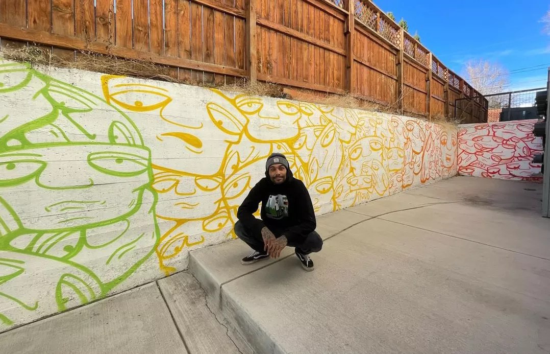 Cabrera has painted over twenty dispensaries since 2018, most recently Brooklyn’s first retail store; the majority of these works feature different versions of his hallmark droopy heads. He also led a collaboration of Denver artists in the painting and decorating of Spark Dispensary earlier this year, and already has plans to paint murals on two new head shops in the city in 2024.