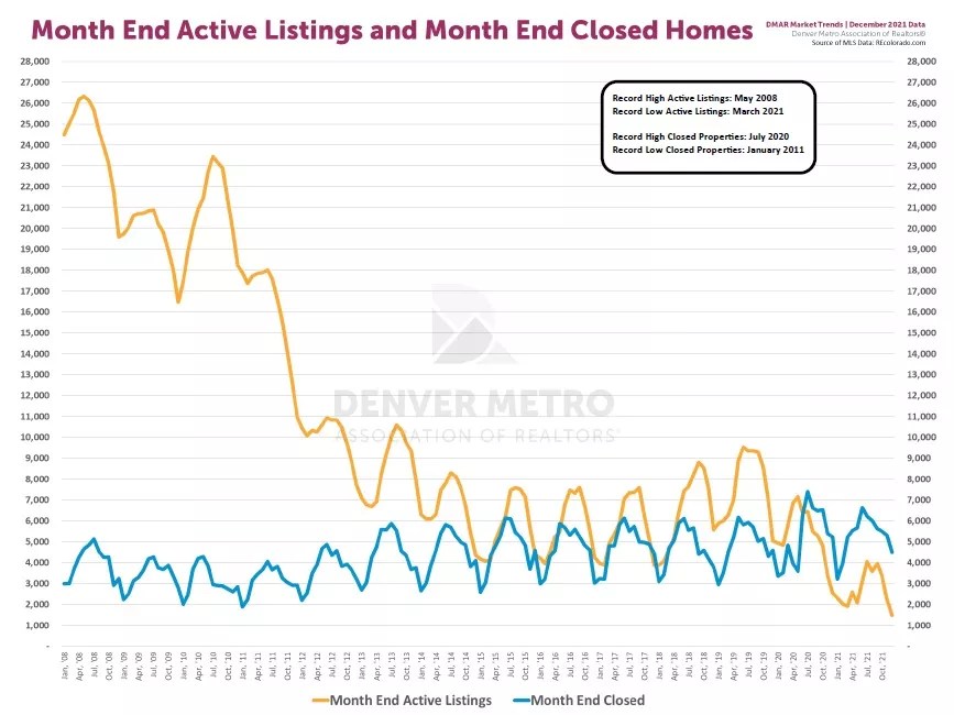 Demand continues to overwhelm supply, as has been the case for more than a year in Denver. The number of new single-family, detached-home listings in December, the most recent month for which data is available, landed at just 1,781, down a staggering 30.43 percent from the 2,560 available in November and 12.78 percent fewer than the 2,042 listed in December 2020.