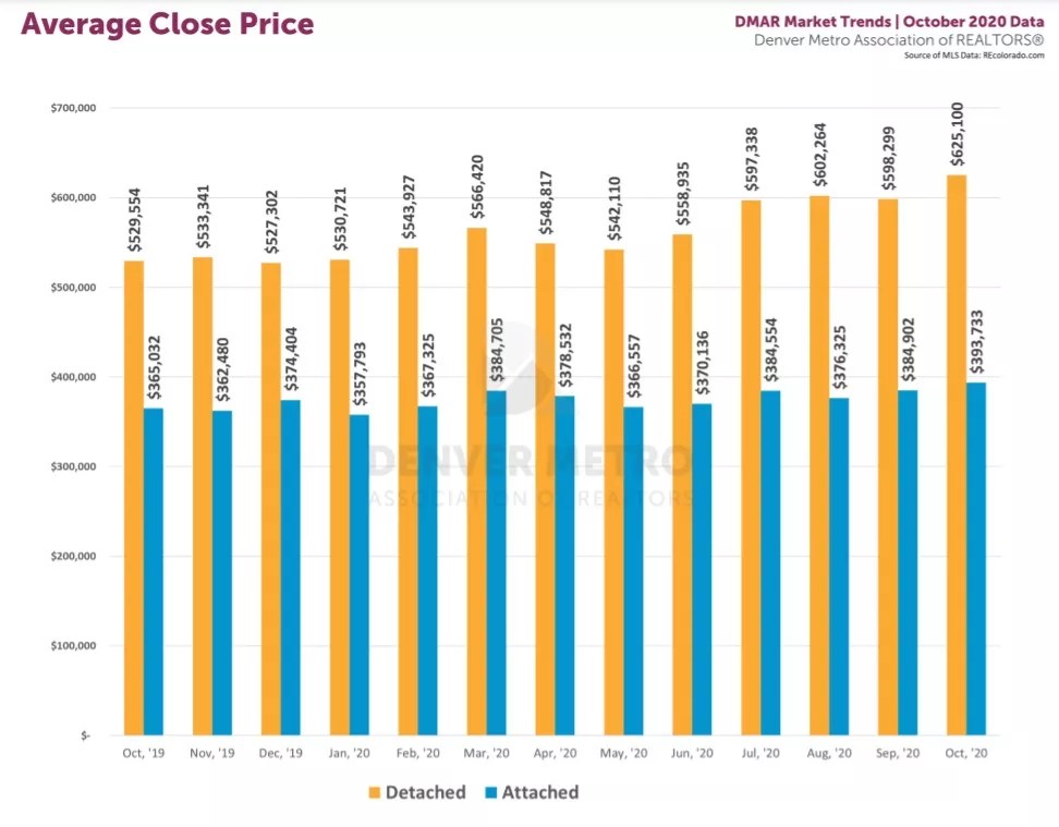 Another month, another record for the Denver housing market, which remains red-hot despite the COVID-19 crisis. According to the November market-trends report from the Denver Metro Association of Realtors, the average closing price for a detached home in the Mile High now sits at more than $625,000, surpassing the old mark by nearly $20,000.