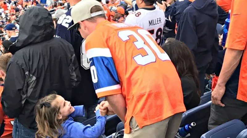 Our cheerleader fist-bumps a next-gen Broncos fan after the game was no longer in doubt.