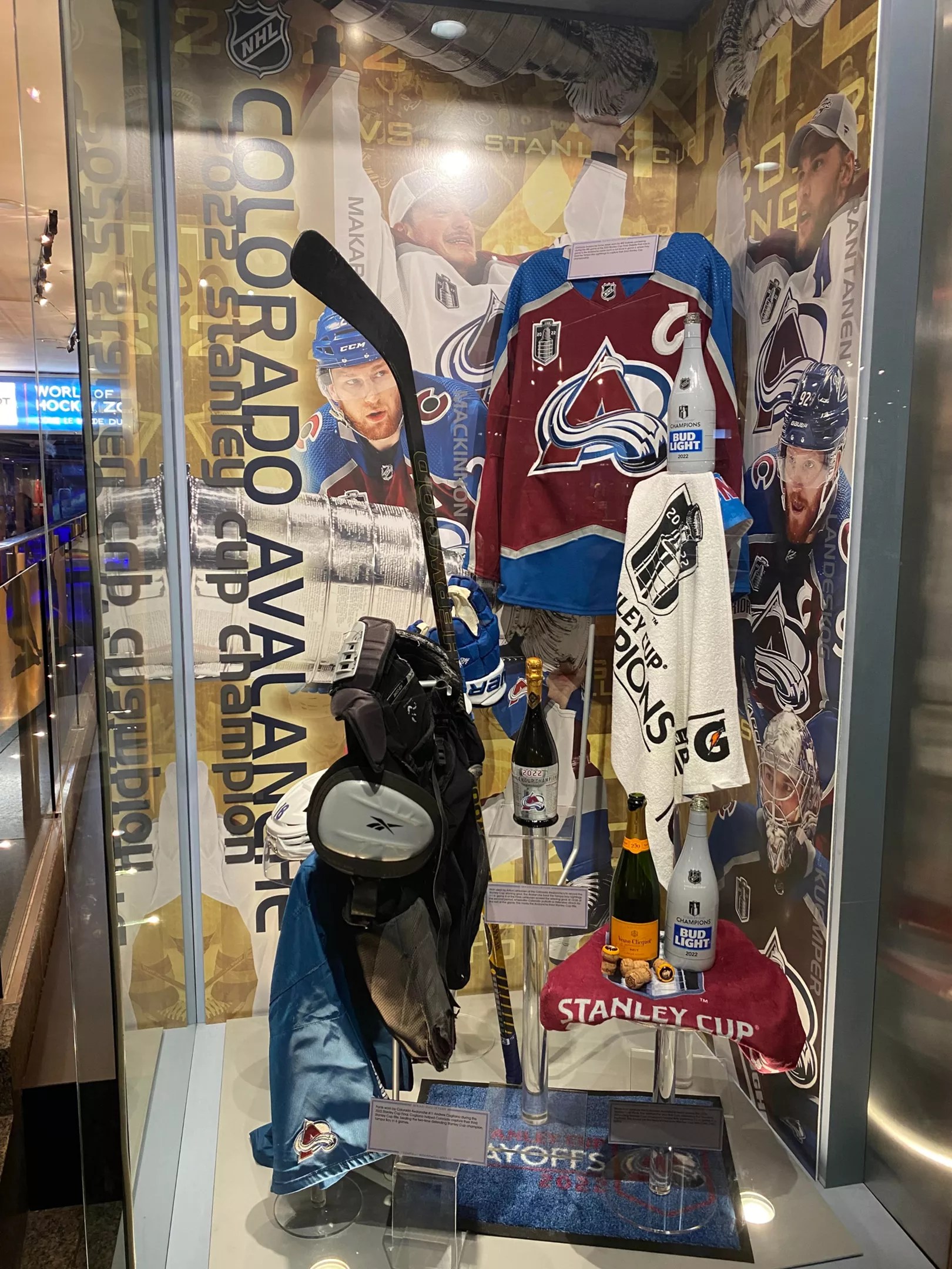 In contrast, the Hockey Hall of Fame was extremely entertaining, with free activities that allow visitors to try to block shots as a goalie and put the biscuit in the basket. Six Avs are Hall of Fame members – Jari Kurri, Rob Blake, Ray Bourque, Joe Sakic, Peter Forsberg and Patrick Roy, who’s the subject of multiple displays devoted to his playing days in Colorado and Montreal – and a separate case was already in place to celebrate the squad’s Stanley Cup championship last month. A display at the Hockey Hall of Fame paying tribute to the 2022 Stanley Cup champion Colorado Avalanche. Photo by Michael Roberts
