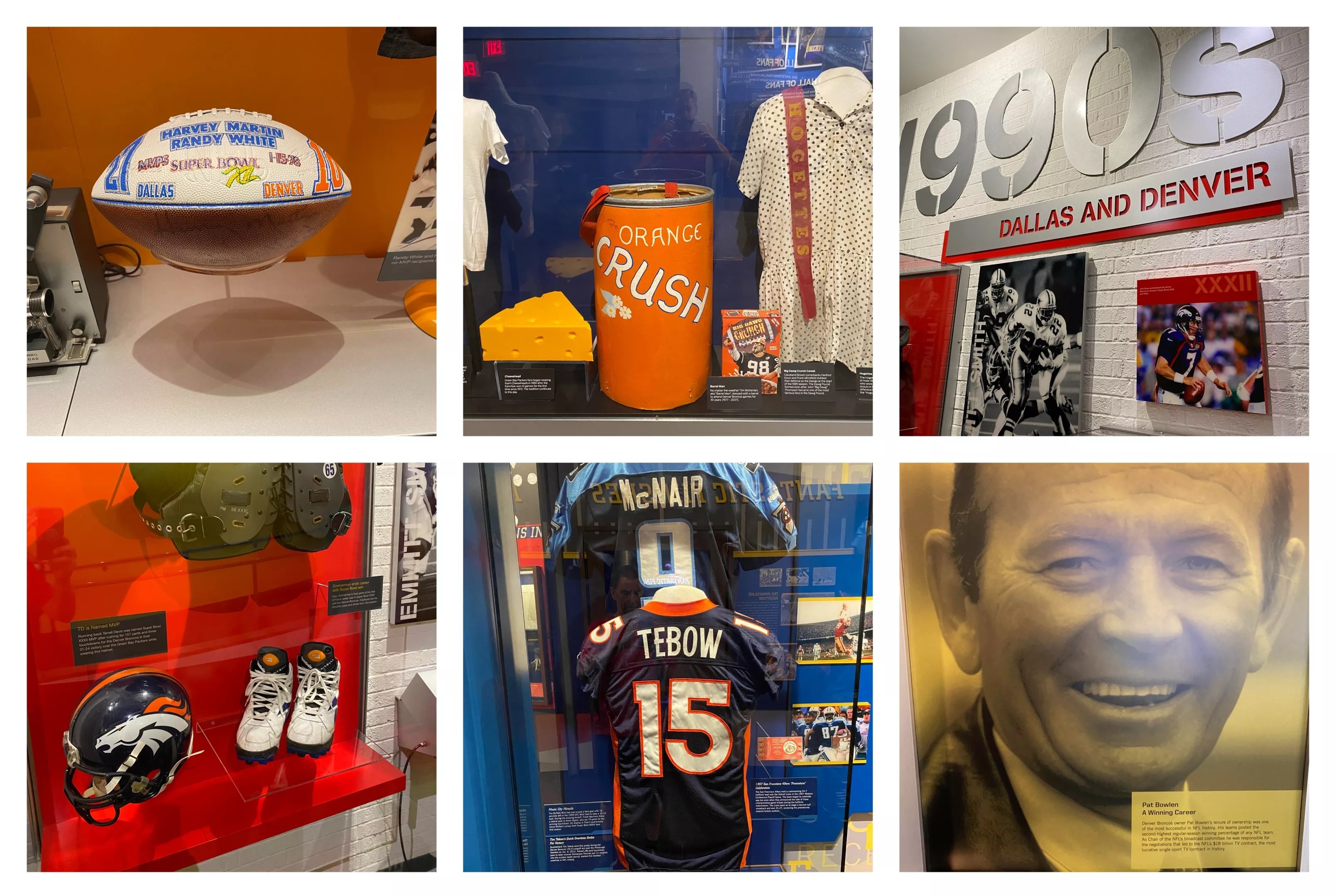 (Clockwise from upper left): A souvenir football from the Broncos’ loss to the Dallas Cowboys in Denver’s first trip to the Super Bowl; the Barrel Man’s Orange Crush outfit as seen in a section devoted to super-fans; a display describing Dallas and Denver as the teams of the 1990s; a tribute to Pat Bowlen for helping negotiate the NFL’s lucrative TV contract; a Tim Tebow jersey; a Terrell Davis helmet.