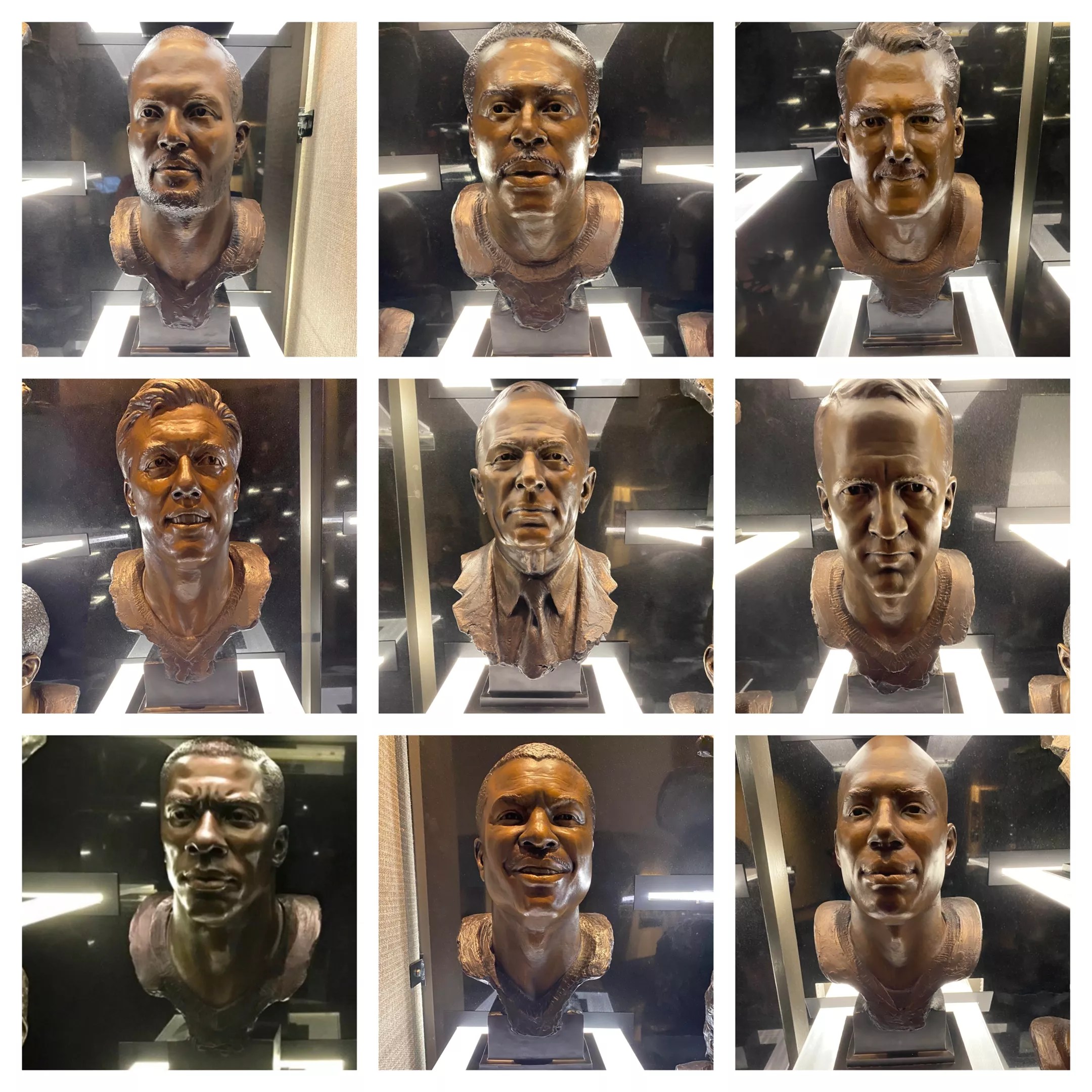 Busts of the Denver Broncos who’ve been elected to the Pro Football Hall of Fame. First row (left to right): Champ Bailey, Floyd Little, Gary Zimmerman. Second row (left to right): John Elway, Pat Bowlen, Peyton Manning. Third row (left to right): Shannon Sharpe, Steve Atwater, Terrell Davis.