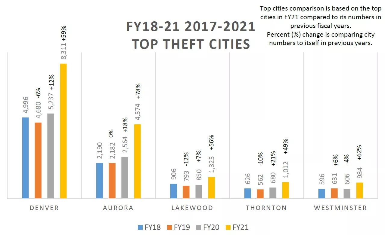 Here’s a graphic showing the jump in car thefts in five cities – Denver, Aurora, Lakewood, Thornton and Westminster – from 2018 to 2021.