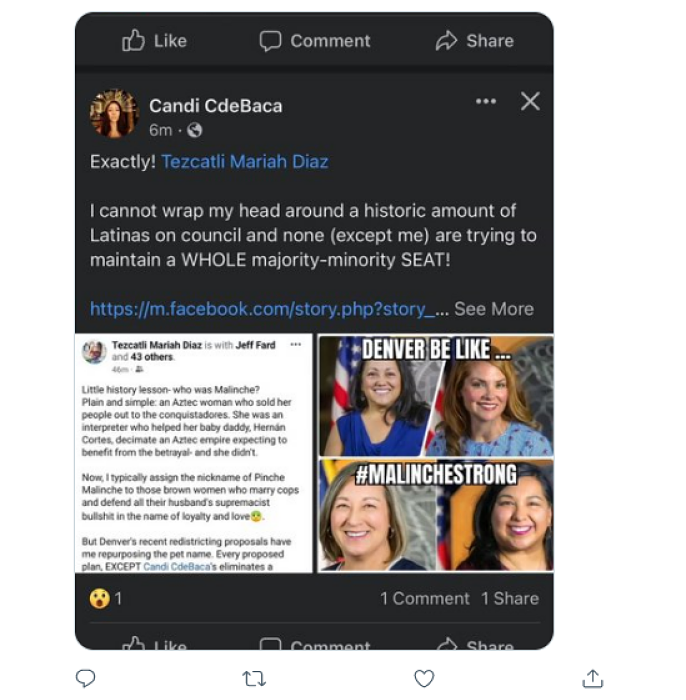 Basta. Enough. A colleague on Denver City Council recently shared a post on social media that had the words “#MalincheStrong” and took a jab at four Latinas on council, inferring that we could not band together and support her proposed map during our redistricting process. Not only is the statement about our redistricting effort flatly wrong because we have not yet voted to advance a final map, but this colleague went on promoting and reposting the graphic labeling us “Malinches.” It is deeply offensive, frustrating and damaging. “Malinche” is not a simple or harmless word to use in any context, and certainly not to call colleagues. It is rooted in racism, sexism and hatred, and its use not only exacts trauma between one another but also brings forth trauma for all Latinas and Chicanas in Denver. We are better than that.