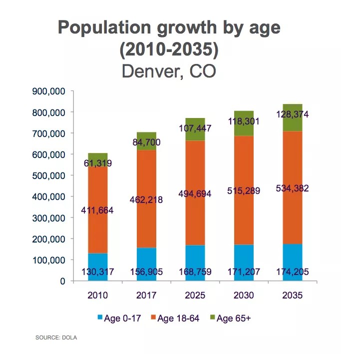 • The number of seniors in Denver will increase by 52 percent between 2017 and 2035, representing the largest share of the city’s population growth over that time. Many aren’t adequately preparing for retirement.