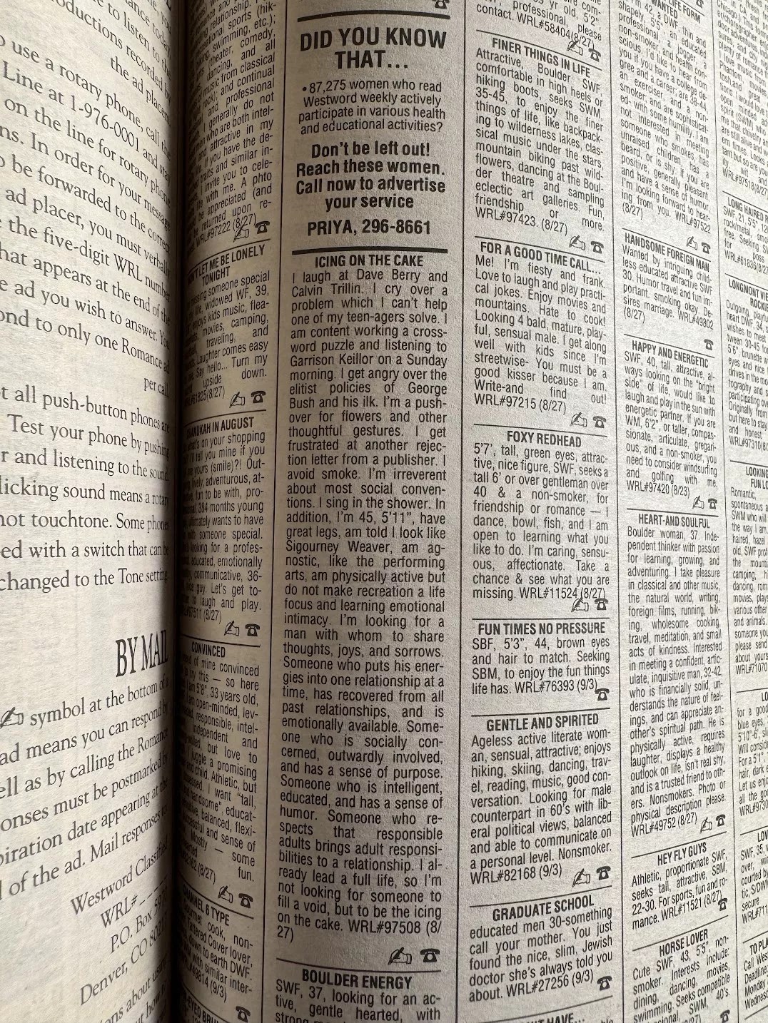 Personal ads were a big part of alternative weeklies in the days before digital publications and online dating. Readers who attended the Westword parties could place personal ads in the Romance section for free. Hicks figured it wouldn’t hurt to have fun with one.