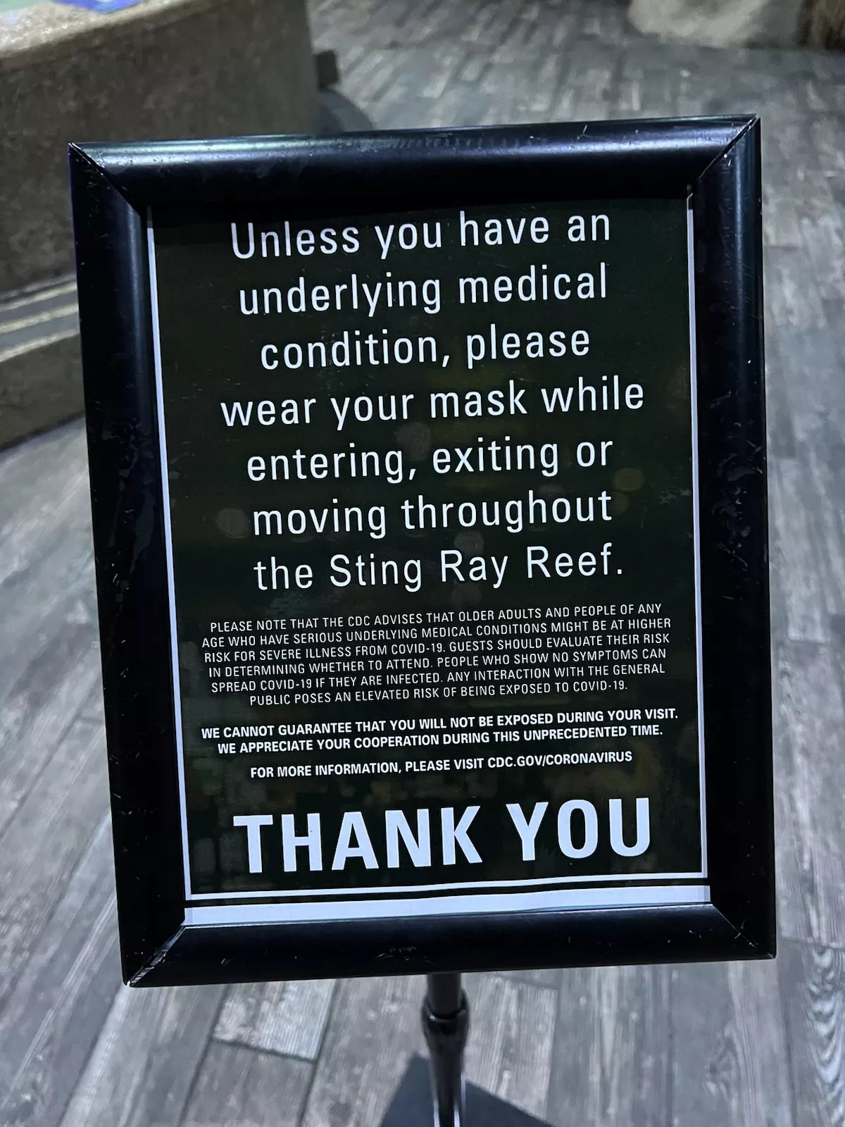 Only four signs in the 100,000-plus-square-foot facility announce the mandate, including one at the entrance where people can buy tickets. After employees asked for more signage throughout the exhibit floor, the company added a sign at the stingray reef. “It’s a very small, overly worded sign that no one is going to look at, no one is going to read, because [Landry’s doesn’t] want to actually appear to be enforcing this,” the employee says.
