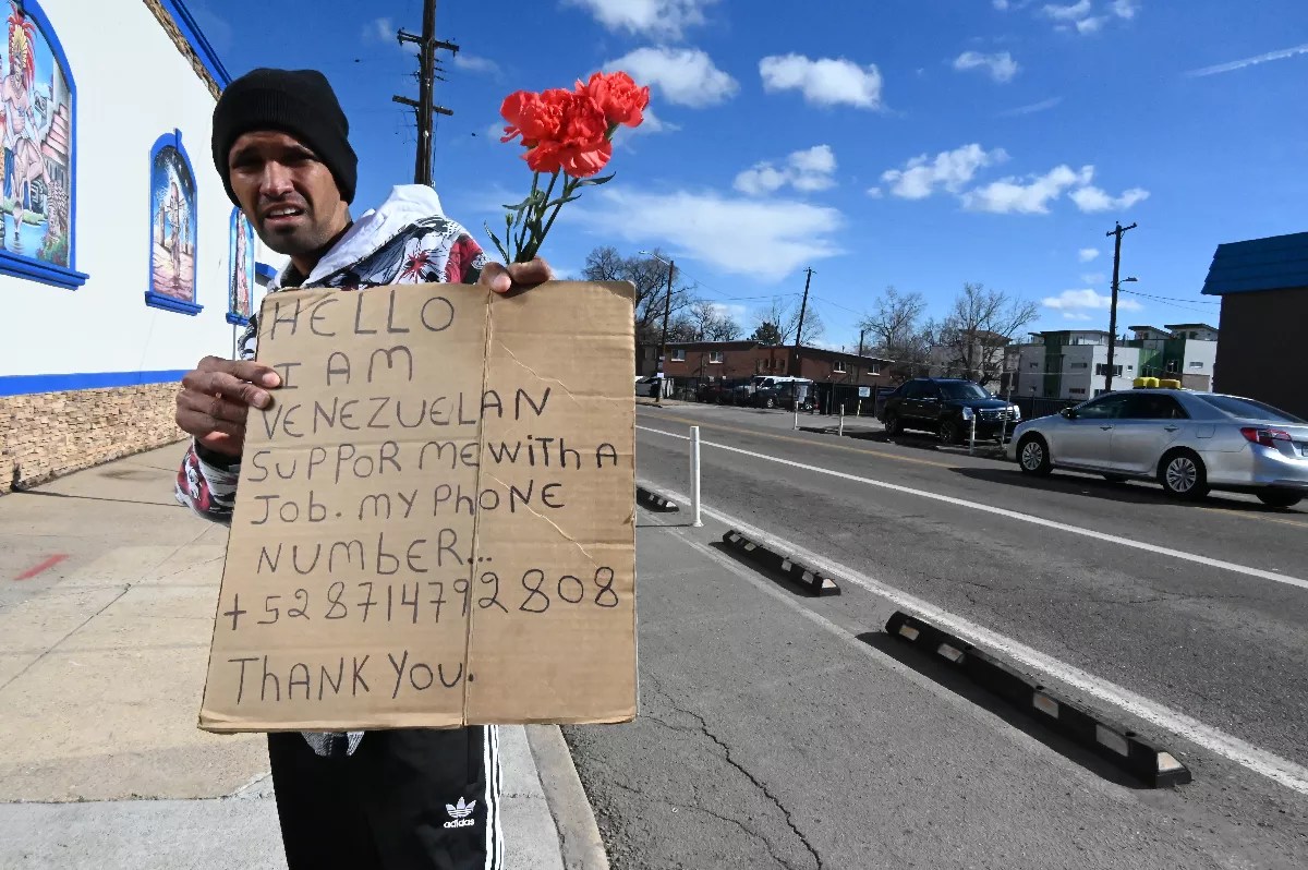 David Lopez, a Venezuelan migrant who arrived in Denver four days ago with his wife and daughter, bought a dozen roses for $7 from another migrant earlier and was selling them on the corner of Federal Boulevard and West 23rd Avenue on Friday. He offers “thanks to the United States and Denver for the opportunity to come here with my family,” but says that services from the city “is all the support we have because we can’t work.”