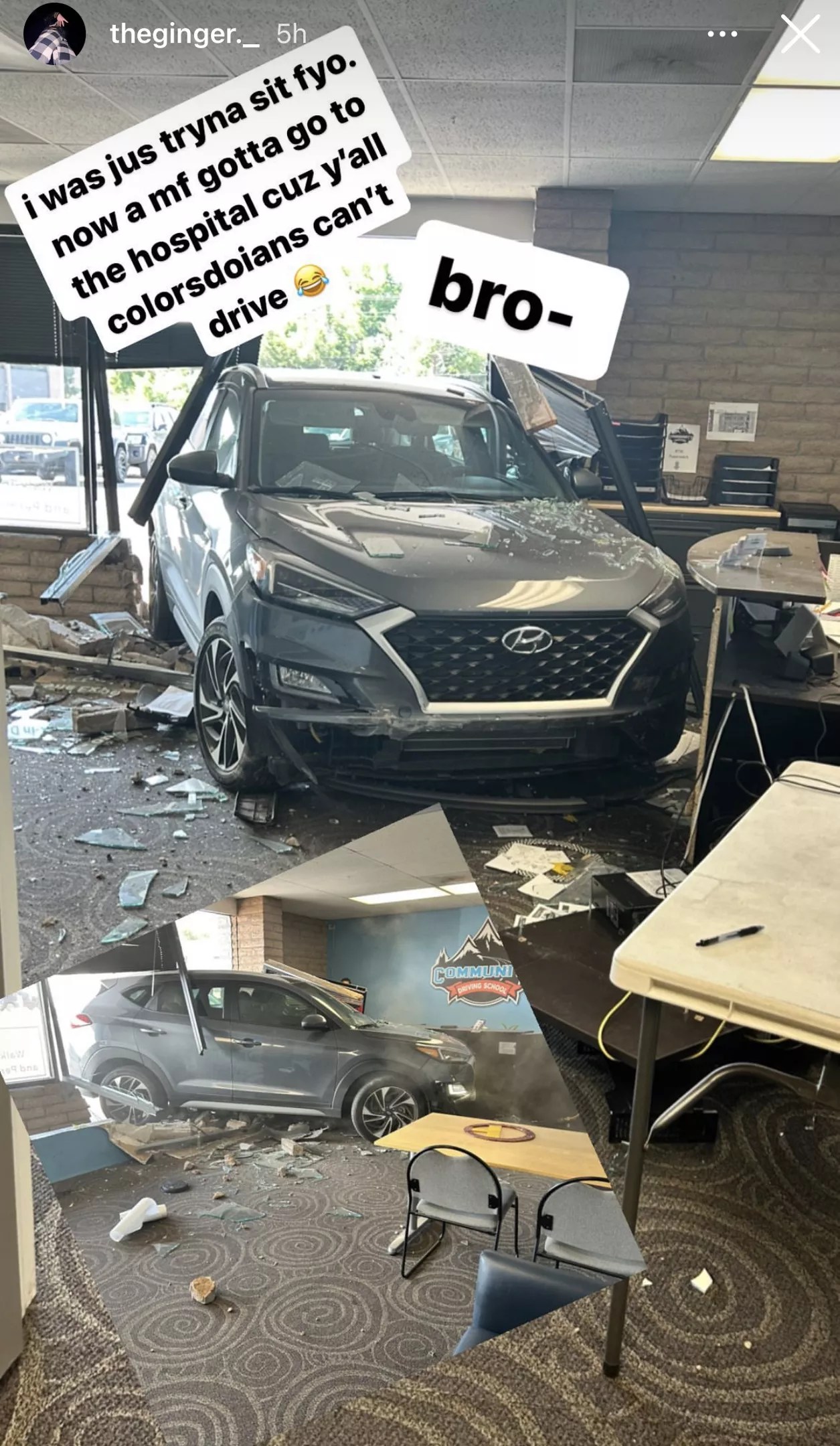 “When you look at our video, it looks like he had just accidentally hit the gas instead of the brakes,” says Anastasia Walfred, co-owner of High Roller Smoke. “Of course, with it being the driving school, all of us in the shopping center are talking and joking about it. The memes have been endless.” An Instagram user named @theginger._ posted pictures from inside the Lakewood driving school, showing the aftermath. @theginger