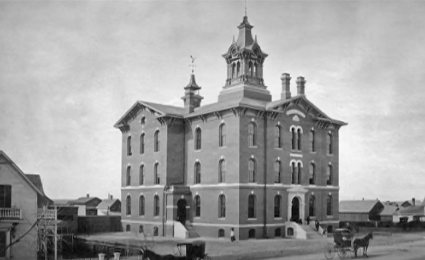 It began, according to East High’s own website, as a “leaky, mud-roofed, one-room log cabin schoolhouse” that sat on 12th Street near Market Street in 1859 – so far back that Market was still named McGaa Street. (William McGaa was a founder of Denver, but also a violent drinker who’d sullied his name so badly by 1866 that the burgeoning city changed the street’s name, and not for the last time.) This proto-East High was called “The Union School,” and enrolled thirteen children in its first year.