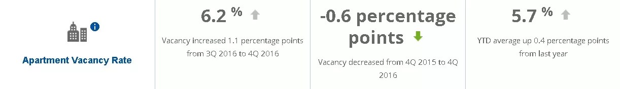 “Home sales in January were up a bit over what they had been in the January 2016 time frame,” Silverstein says. “We also continue to see some very strong increases in home prices, and that’s a factor for whether or not folks can afford to purchase a home that carries over to our next indicator, the apartment vacancy rate. In general, we’ve seen that the vacancy rate has been going down, and the apartment lease rate has been going up.”