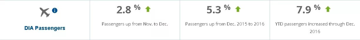 Visitors are also having a positive impact on the Denver economy. Hotel occupancy was down a bit last month compared to January, “but not significantly,” Silverstein stresses. “That’s more a reflection of us having more hotel rooms available in the market in January 2017 than we did a year ago. And tourism activity has still been running at a pretty strong pace. An indicator is DIA passenger traffic through December 2016, which was up substantially. That 7.9 percent increase was one of the stronger increases in passenger traffic that we’ve had in quite some time.”
