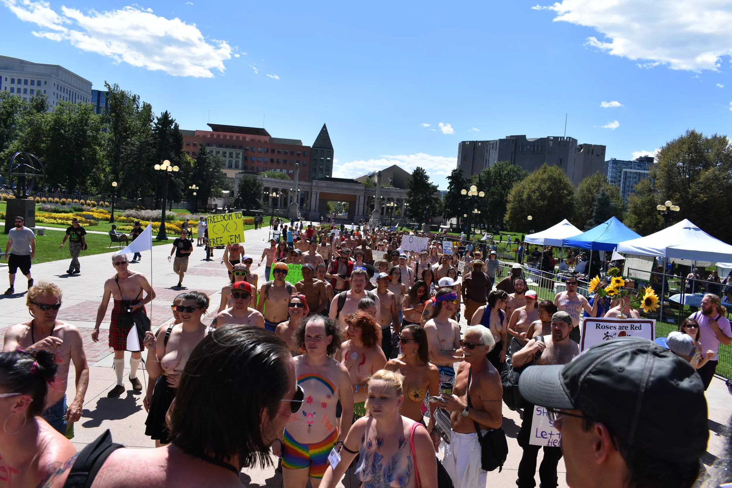 Participants will gather at Denver’s Civic Center Park around 11 a.m. August 28, with a march along the 16th Street Mall starting at noon. The organization’s announcement is topped by four exclamations: “Open mind required! Tops are optional! Sunscreen recommended! Admission is free!”