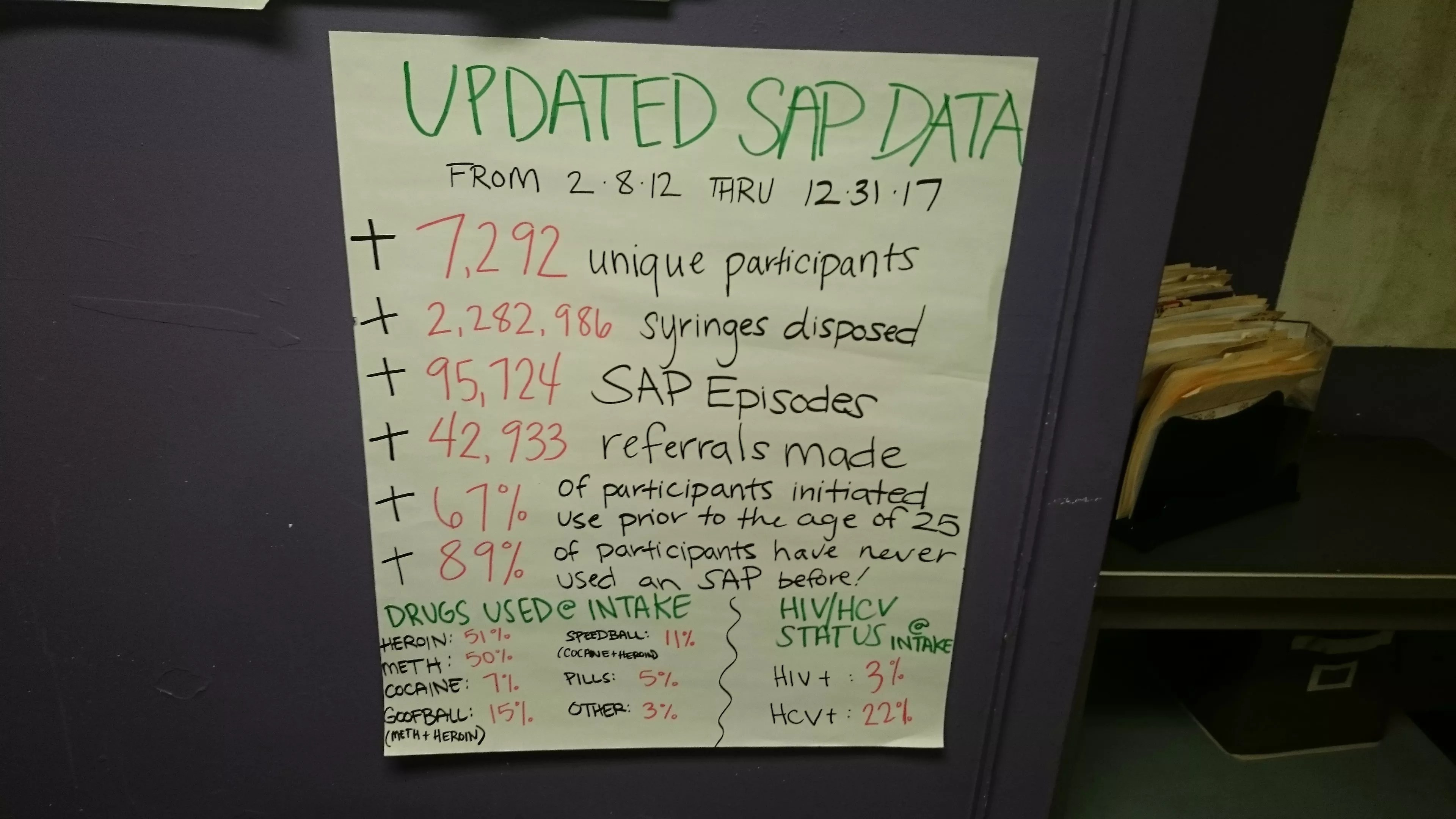 This white board includes key statistics about the Harm Reduction Action Center.