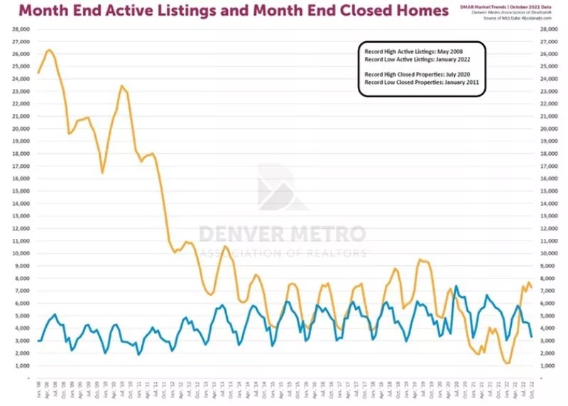 The following graphic, which covers the period from January 2008 to October 2022, illustrates the changes. The yellow line represents active listings at the end of the month, and it descended below the blue line, which depicts closed listings at month’s end, in July 2020 – and stayed beneath it for two years. Now, though, active listings are on top again.