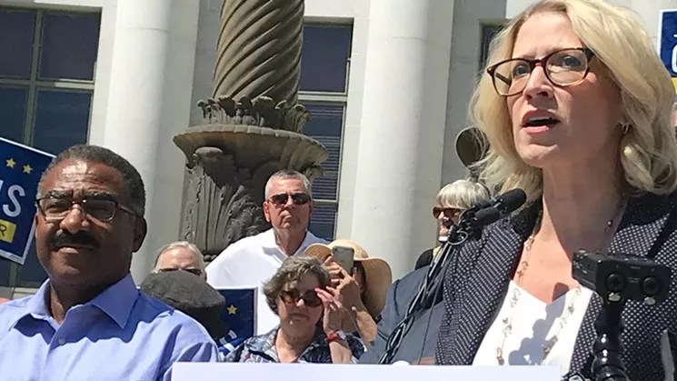 Mayoral candidate Penfield Tate joined Jamie Giellis in a Team of Rivals announcement on the steps of City Hall after the May 7 election.