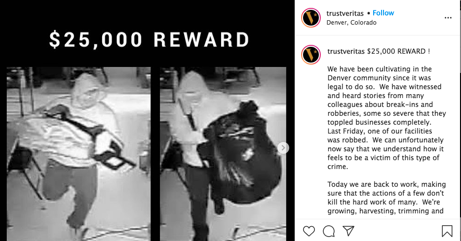 The Denver Police Department is investigating the theft, and Veritas also plans to hire a private investigator. But the company isn’t depending on either of those probes to nab the thief. On its Instagram page, Veritas is offering $25,000 to anyone who provides “information that leads to the arrest and conviction” of the two individuals seen on security footage; tips can be sent to info@veritascannabis.com.