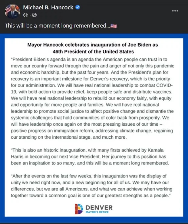 On January 20, Denver joined (most of) the rest of America in finally taking a deep breath after a four-year fog of bullshit. People took to social media to share their relief and joy – during the COVID-19 pandemic, online is the safest way to celebrate – and Mayor Michael Hancock joined in, too. The manner in which he celebrated, however, was a little unique. He posted a long official announcement, leading with the line “This will be a day long remembered.”