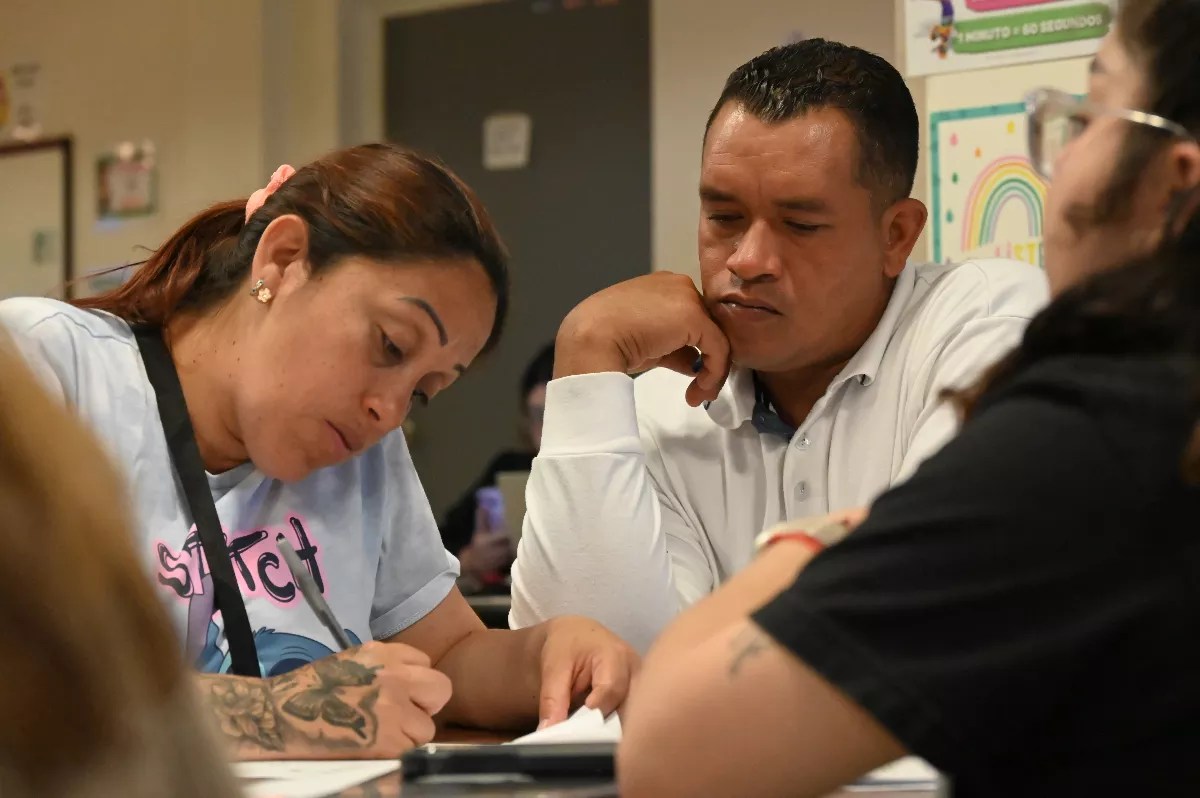 Rony Blanco and Yenire Cirilo sign the paperwork to join the Denver Asylum Seekers Program.