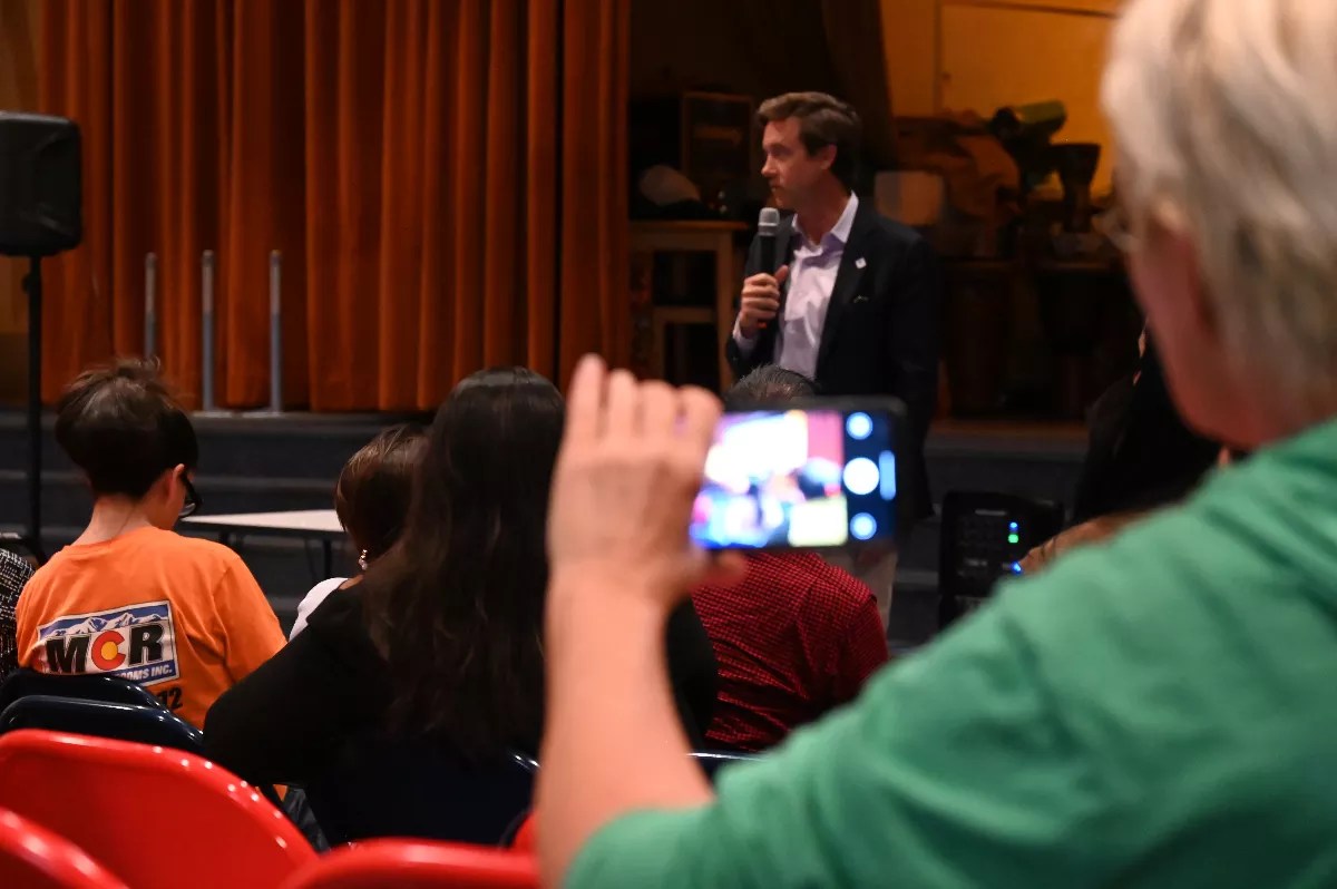 Mayor Mike Johnston speaks at a community information meeting in Montbello about an incoming micro-community.