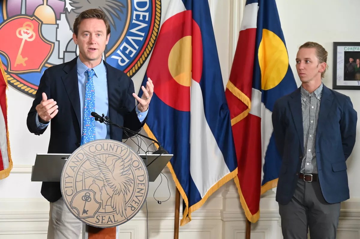 Mayor Mike Johnston stands with his new senior advisor on homeless resolution, Cole Chandler, who will help him shelter 1,000 people by 2024.