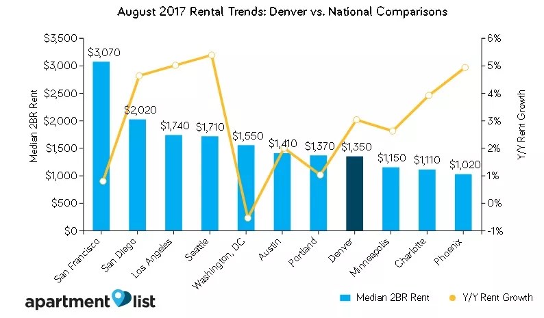 Another graphic puts Denver rent costs for a two-bedroom apartment in perspective by comparing them to the prices for such a space in other major American cities.