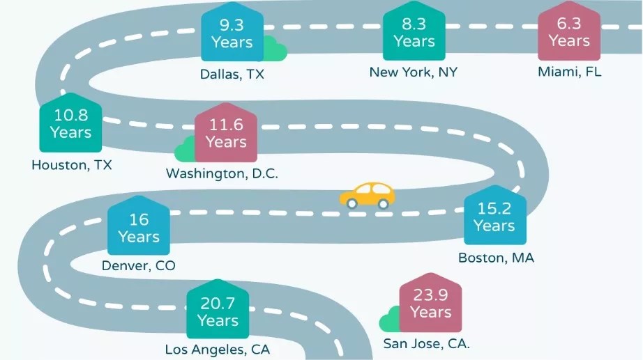 This graphic shows how long it will take millennials in various major cities to save enough for a down payment on a home.