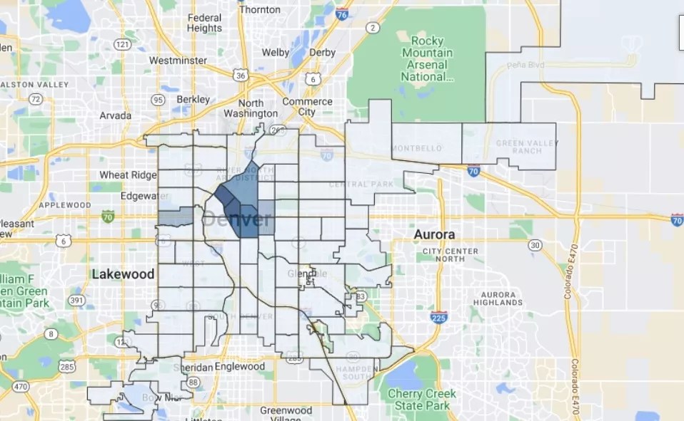 A screen capture of the Denver Crime Map on April 22, 2022. The darker areas denote higher crime levels.