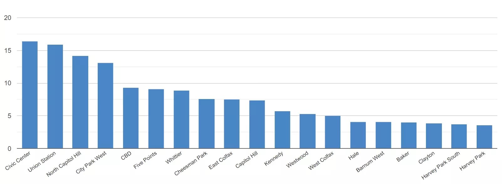 During the two-week period from September 19 to October 3, the two areas with the most violent crime were Civic Center (16.4 offenses per square mile) and Union Station (15.9). Both were also atop the violent-crimes roster for the period of July 2-16, but in reverse order, and their totals were lower then: Union Station notched 18.2 offenses per square mile, while Civic Center recorded 16.4. Union Station was also the area with the most property crimes from September 19-October 3, with 100.2 offenses per square mile – considerably lower than the 123 offenses documented for the Central Business District, which topped that category from July 2-16.