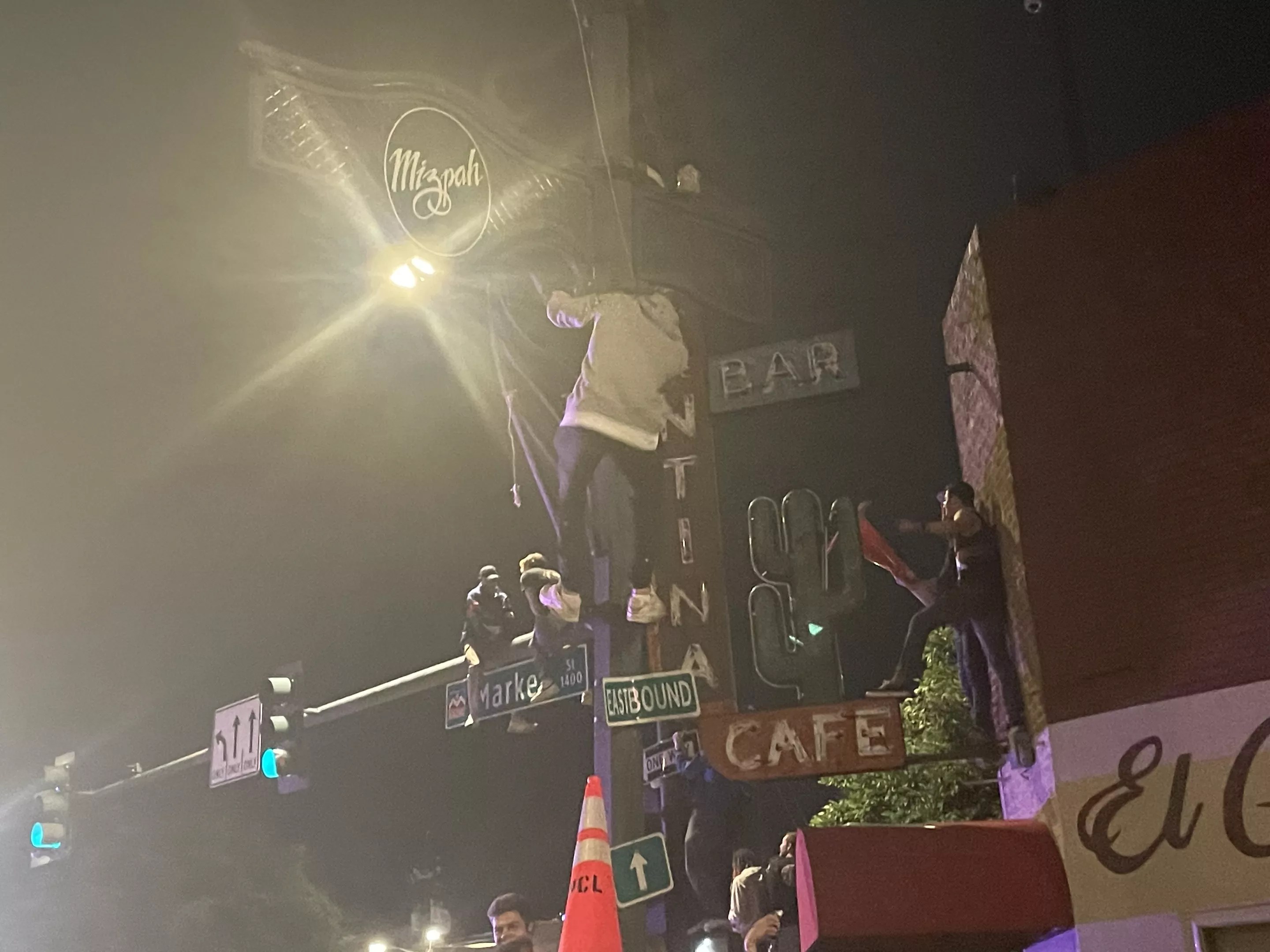 Revelers after the Nuggets championship win climbed the El Chapultepec sign before the shooting a block away.