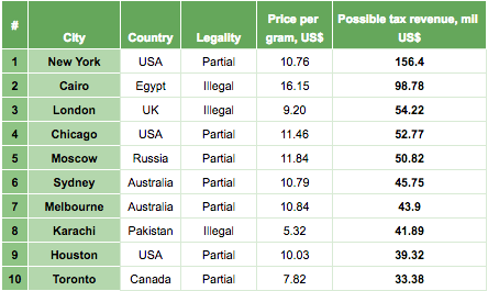 The study also compared 120 different cities throughout the world to see which would see the most revenue if marijuana were legalized around the globe, and found that while New York would top the chart, Cairo would see the next-biggest boom from a green rush. Considering Egypt’s strict drug laws, though, it’s hard to imagine anyone legally lighting up a spliff next to the Great Pyramid anytime soon. Other surprising entries in the top-ten list were Moscow and Karachi, Pakistan.